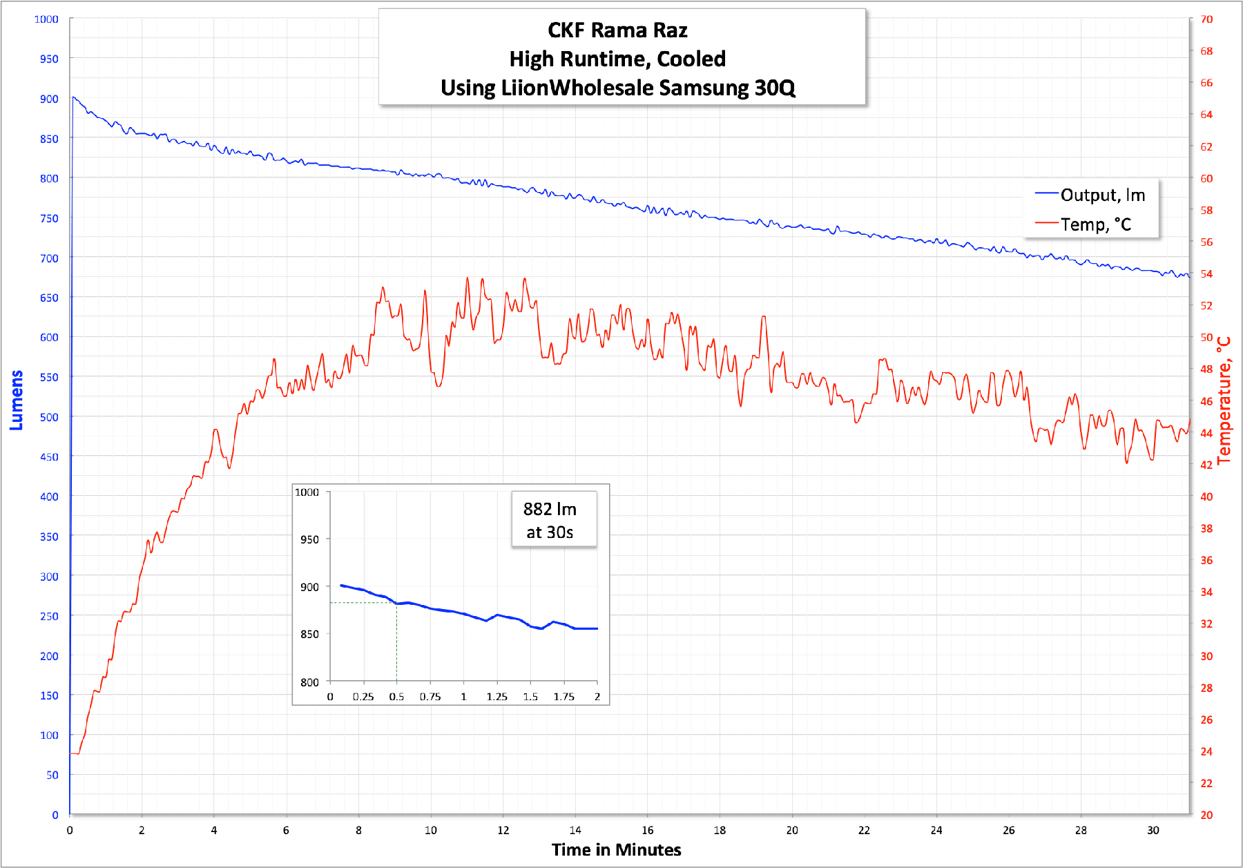I tested the light with the included cell. Here’s a runtime on High. The output is unregulated and just tracks voltage all the way down. There does not seem to be any LVP, something I confirmed with bench power. Interestingly, the output increases within the first couple of minutes, and temperature tops out in the mid-50s (!!!) and gradually declines as the output does.
