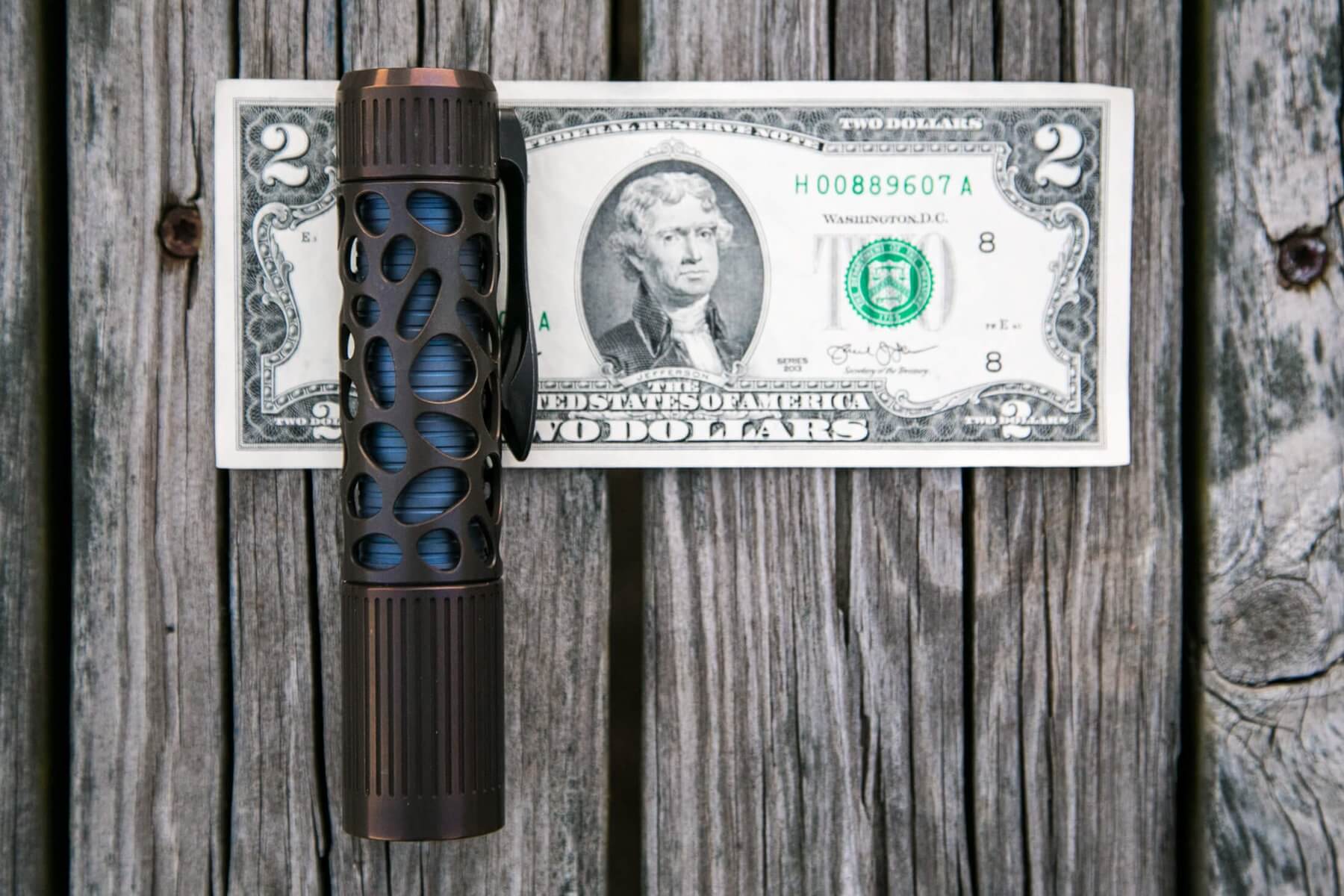 There’s a pocket clip attached to the tail of the light. It’s held in place by two Torx screws. The clip on the Raz matches the body tube, with holes and a sort of flowy shape. But it works just fine as a clip and doesn’t carry funny or anything. The clip, too, has a nice finish and is also titanium. The hole spacing on the clip is much narrower than the spacing of, for example, a SteelFlame clip.