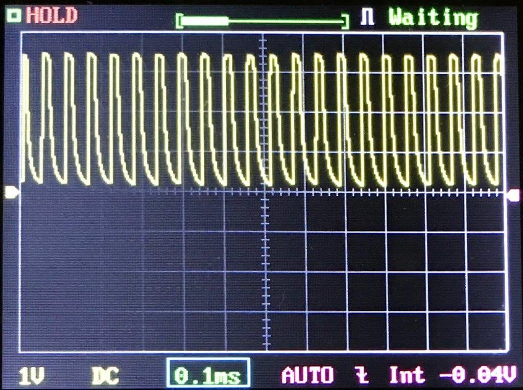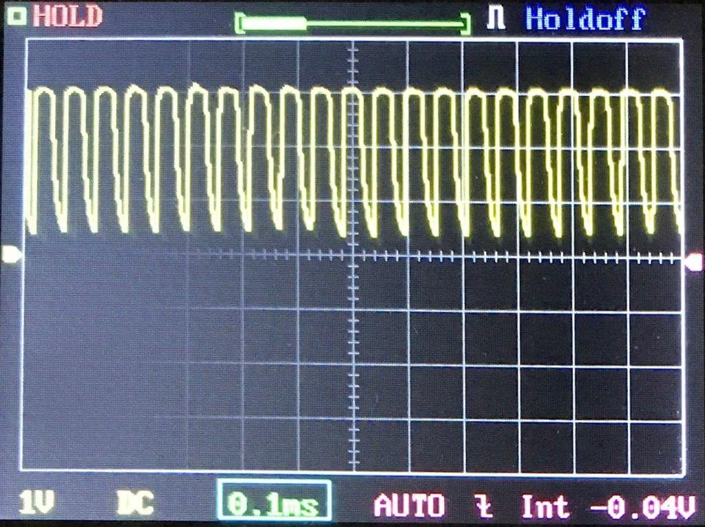 Then there’s the Ultrafire WF-602C flashlight, which has some of the worst PWM I’ve seen. It’s so bad that I used a post about it to explain PWM! Here are multiple timescales (10ms, 5ms, 2ms, 1ms, 0.5ms, 0.2ms) to make comparing this “worst” PWM light to the test light easier. That post also explains why I didn’t test the WF-602C at the usual 50us scale.