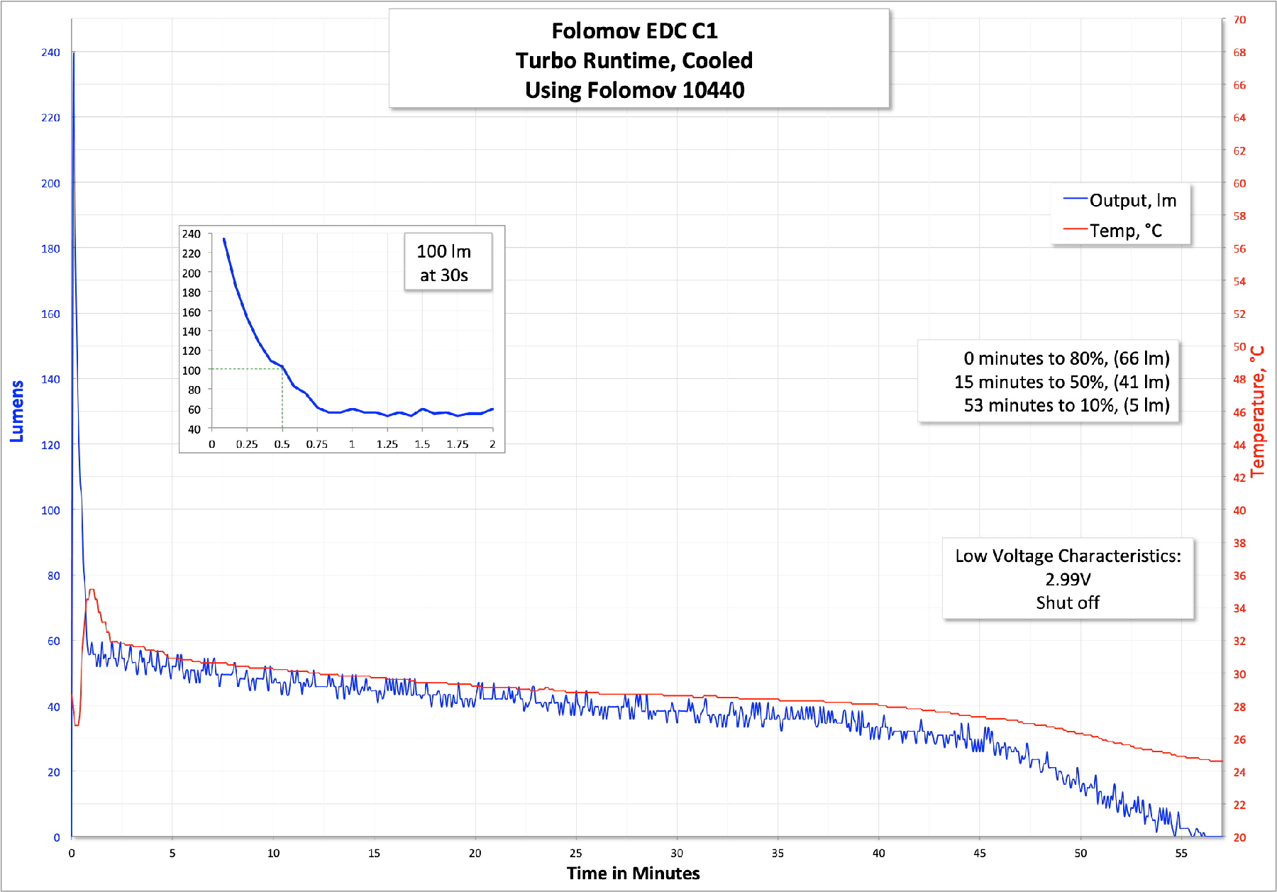 I tested (but didn’t graph) the light with an Efest 10440, and the output max is the same. No difference at all. So while the Folomov 10440 might be smaller because of the charge circuit, it’s just as capable as the Efest 10440’s I have.