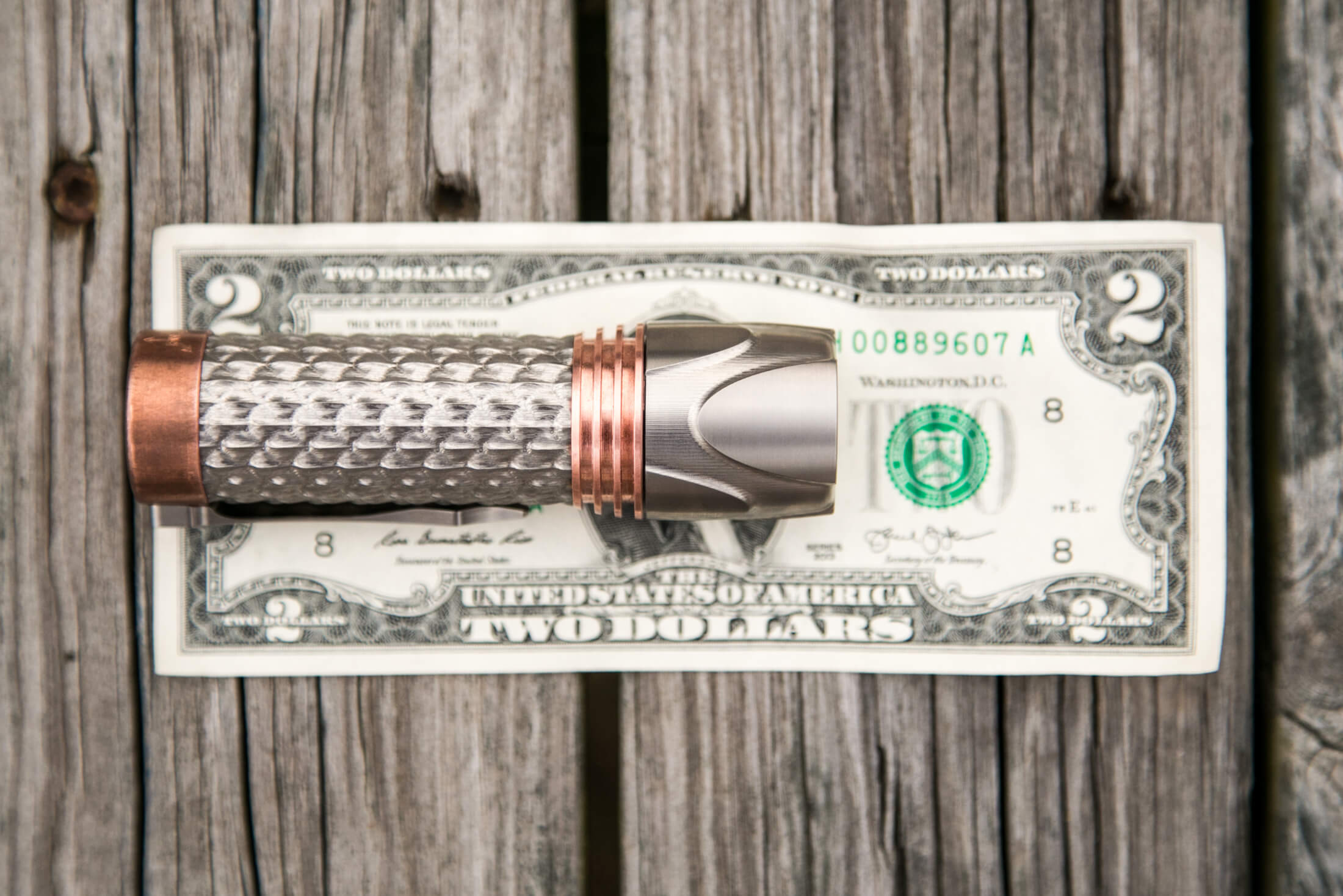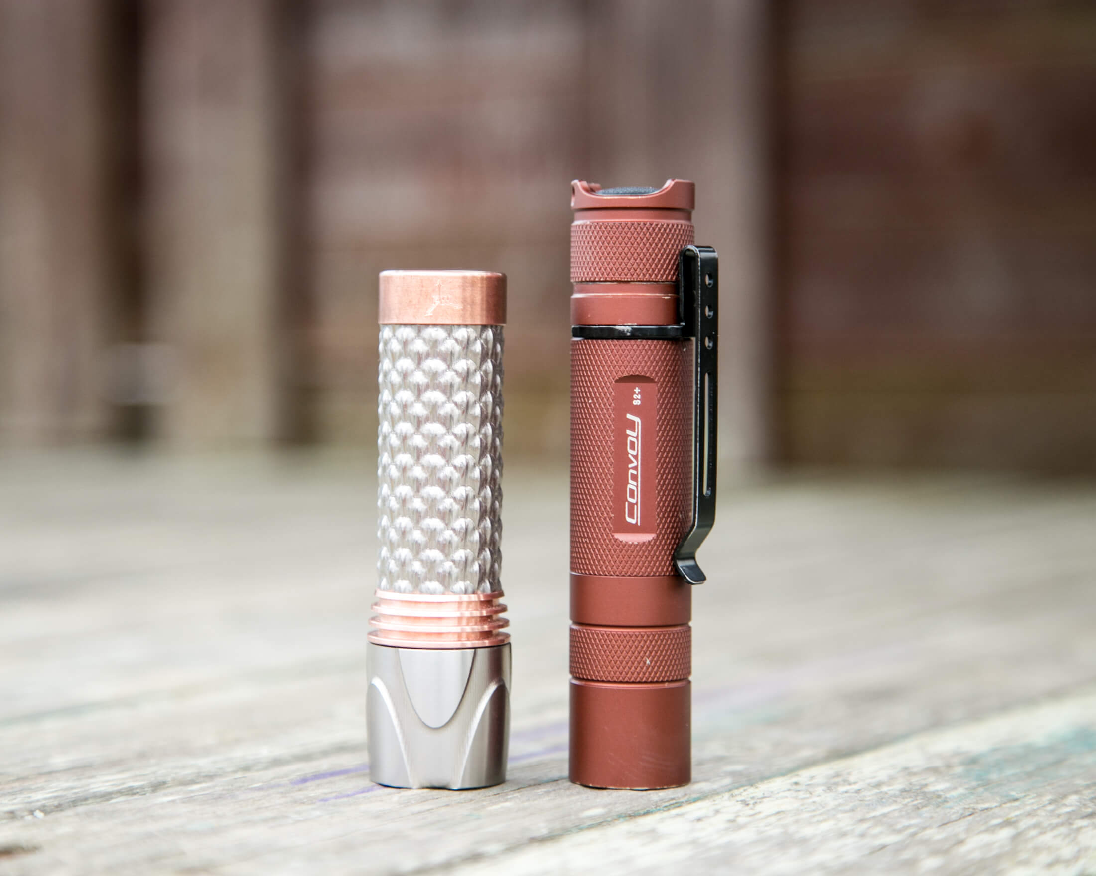 The FocusWorks Eryx F1 is an unusual flashlight with “dragon skin” finish on the body. Titanium and copper parts make this a pretty light!