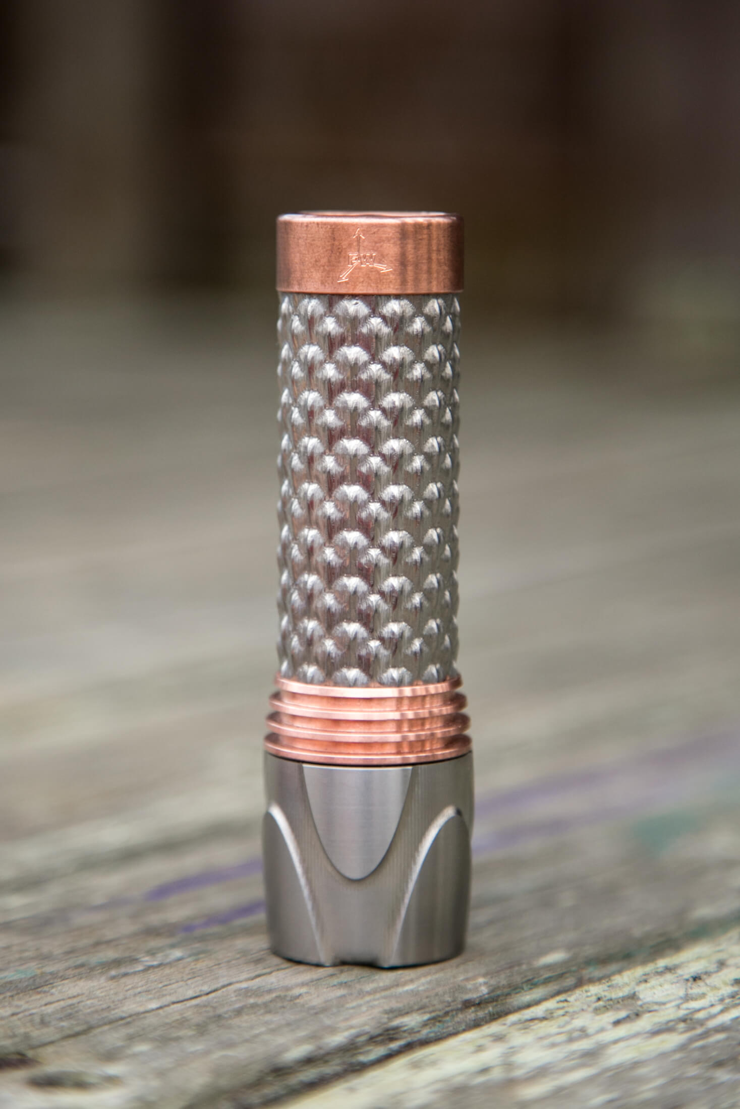 Aside from the scales, note the titanium and copper mix. There are full copper and full titanium versions available, but this version is probably the best mix (opinion, of course). The copper below the head is needful for dissipating the heat from the 219c emitter!