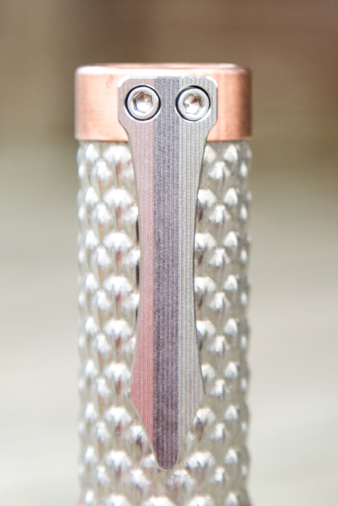 The main way to EDC the light is the pocket clip, which attaches to the tail with two Allen screws. This is one of those “cut” clips, not a stamped steel clip.