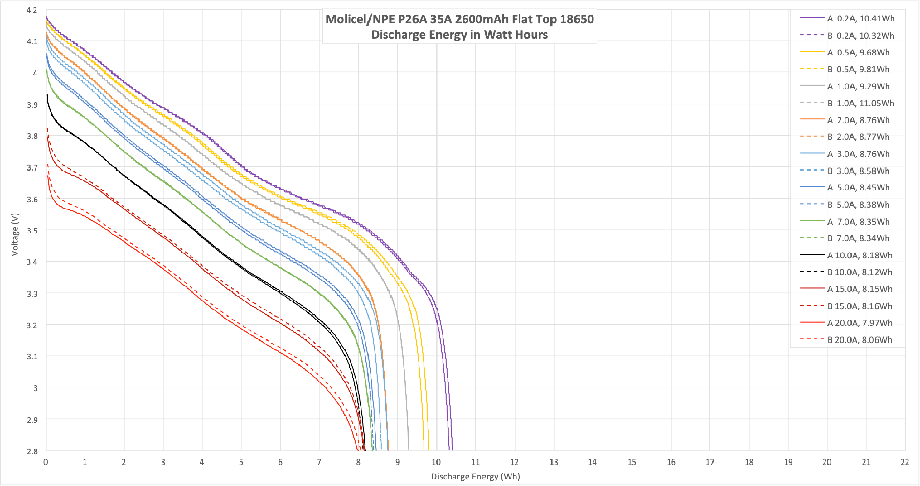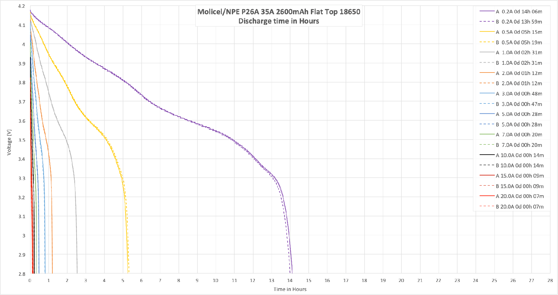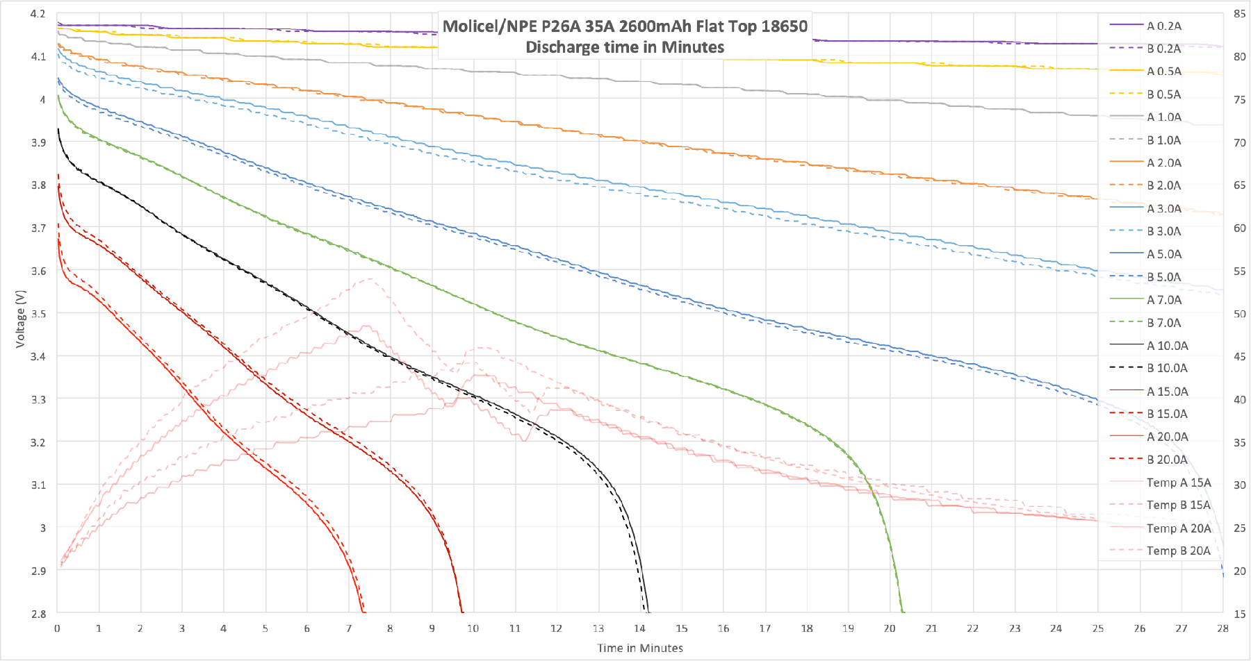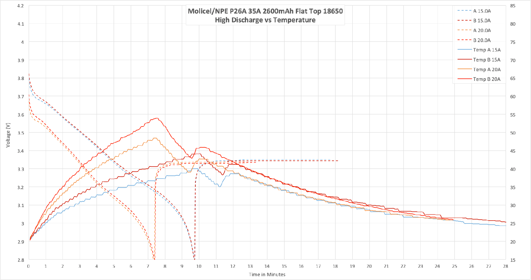 Here’s some testing of the Molicel P26A. I only tested up to 20A, though the max claim is 35A. Based on the temperature and 20A performance, the cells can certainly handle higher than 20A!