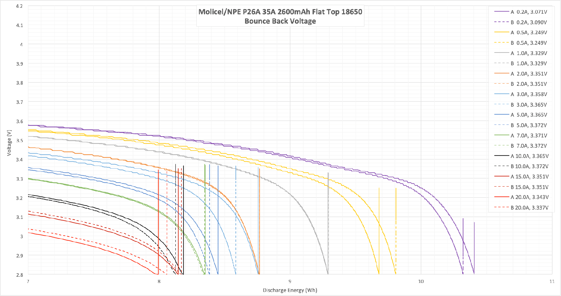 Bounce is good on this cell, with everything over 7A or so not bouncing back to much above 3.3V. That indicates a good performance at these higher currents.