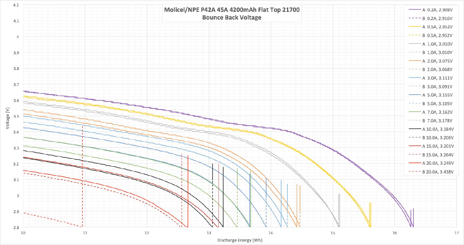 “Bounce back” is what the cell voltage does when the cell rests after a discharge. After heavy discharge rates, the cell voltage bounces back higher when discharge is stopped. This corresponds to a discharge amount of less energy and does mean that there’s energy left in the cell. So if I selected the cell with the highest bounce back voltage (i.e., the cell that was discharged at the highest current), then discharged it to 2.8V at 0.2A, I’d still find that there was a lot of energy still in the cell.
