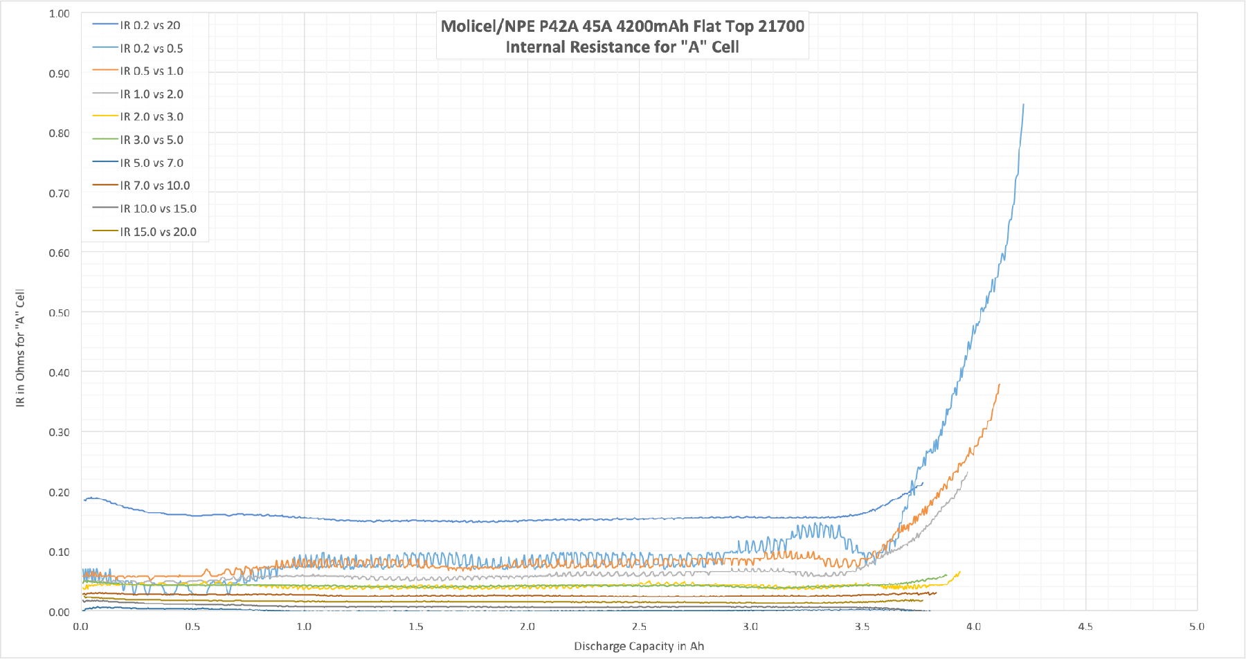 Here is why I think it is so interesting about “Bounce.” A poorly performing cell will bounce back higher after high discharges. That’s because the IR is higher, and because the cell performs much worse under high loads. So a good-performing cell will bounce back much less because it’s much more capable of high discharge. At high discharge on a capable cell, more of the energy makes its way out of the cell! Hence, less bounce.