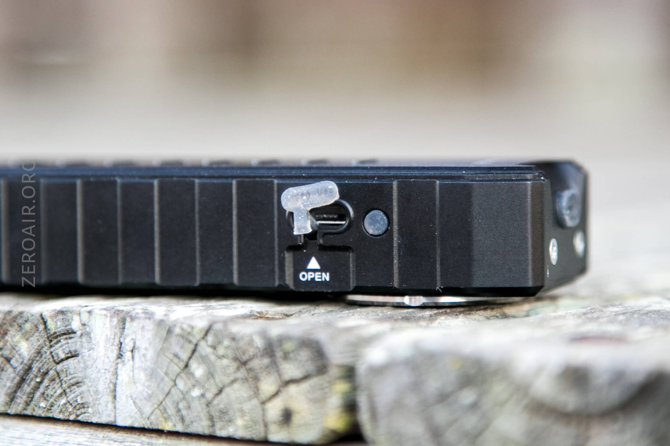 With the internal battery comes built-in charging. There’s a micro-USB port on the side, plugged with a rubber cover just like on the Aurora series. (A spare cover is included.) Beside this port is a charge indicator.