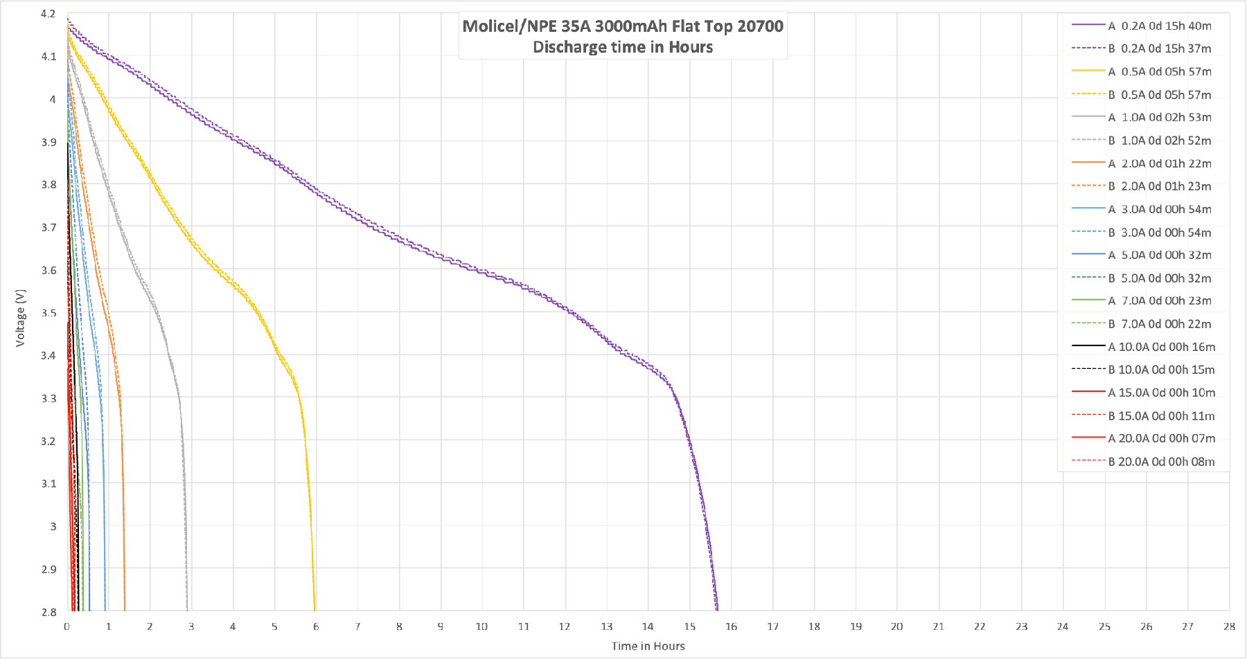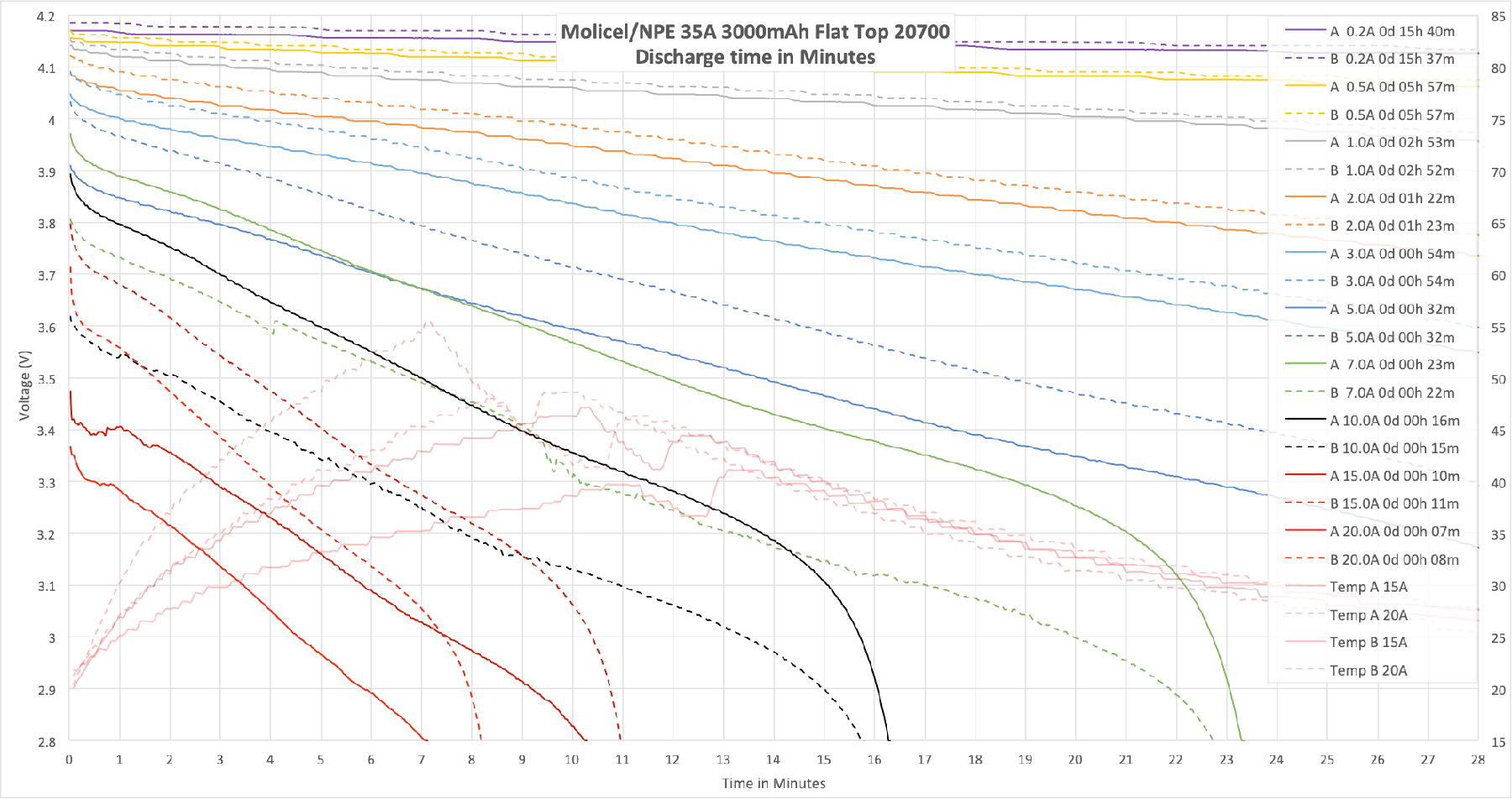 This cell meets its claim of 3000mAh. I can’t test over 20A, but the cell does seem to perform capably at 20A. There was a little bit of inconsistency between the high current testing results, but this could just be due to temperature variations in the room.