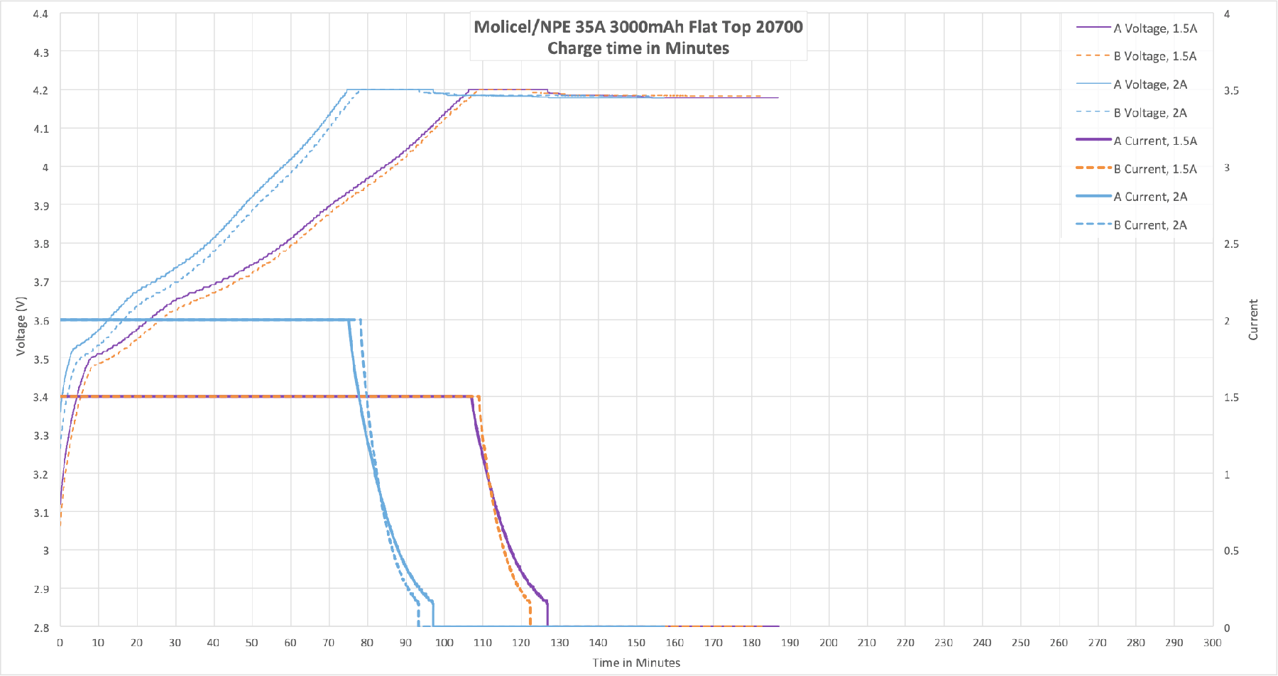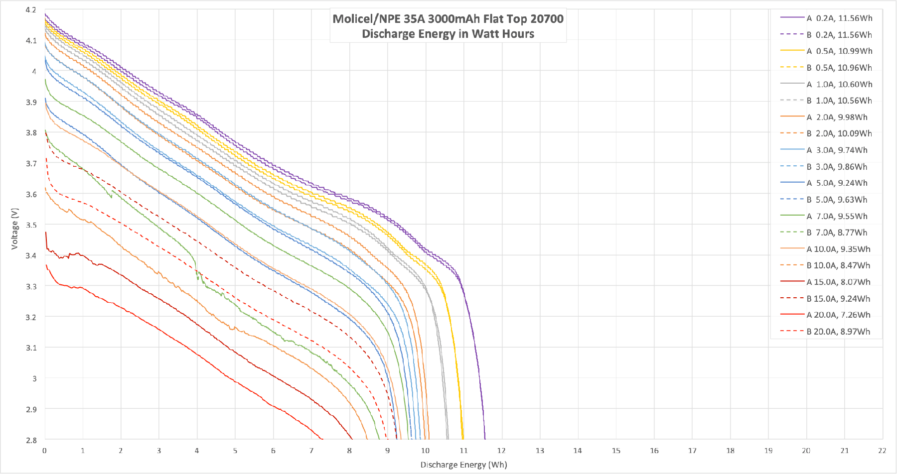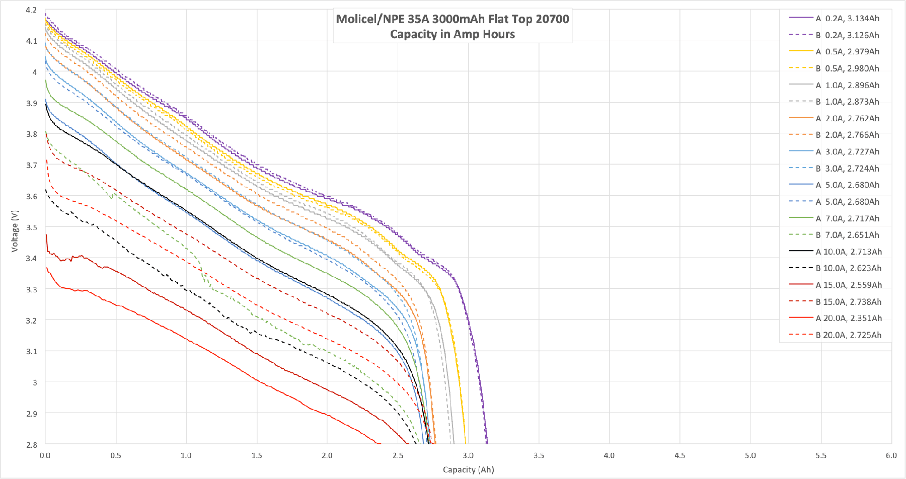 The Molicel/NPE Lithium-Ion Cell is a very high current (35A) 20700 cell with a capacity of 3000mAh. Read on for all the data you could want!