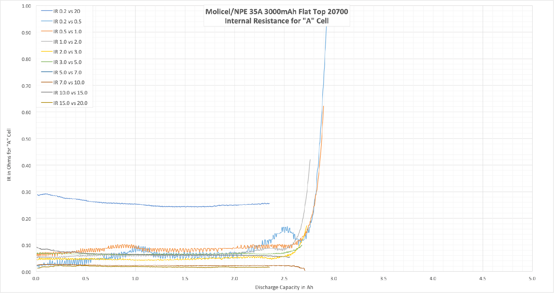 Here is why I think it is so interesting about “Bounce.” A poorly performing cell will bounce back higher after high discharges. That’s because the IR is higher, and because the cell performs much worse under high loads. So a good-performing cell will bounce back much less because it’s much more capable of high discharge. At high discharge on a capable cell, more of the energy makes its way out of the cell! Hence less bounce.