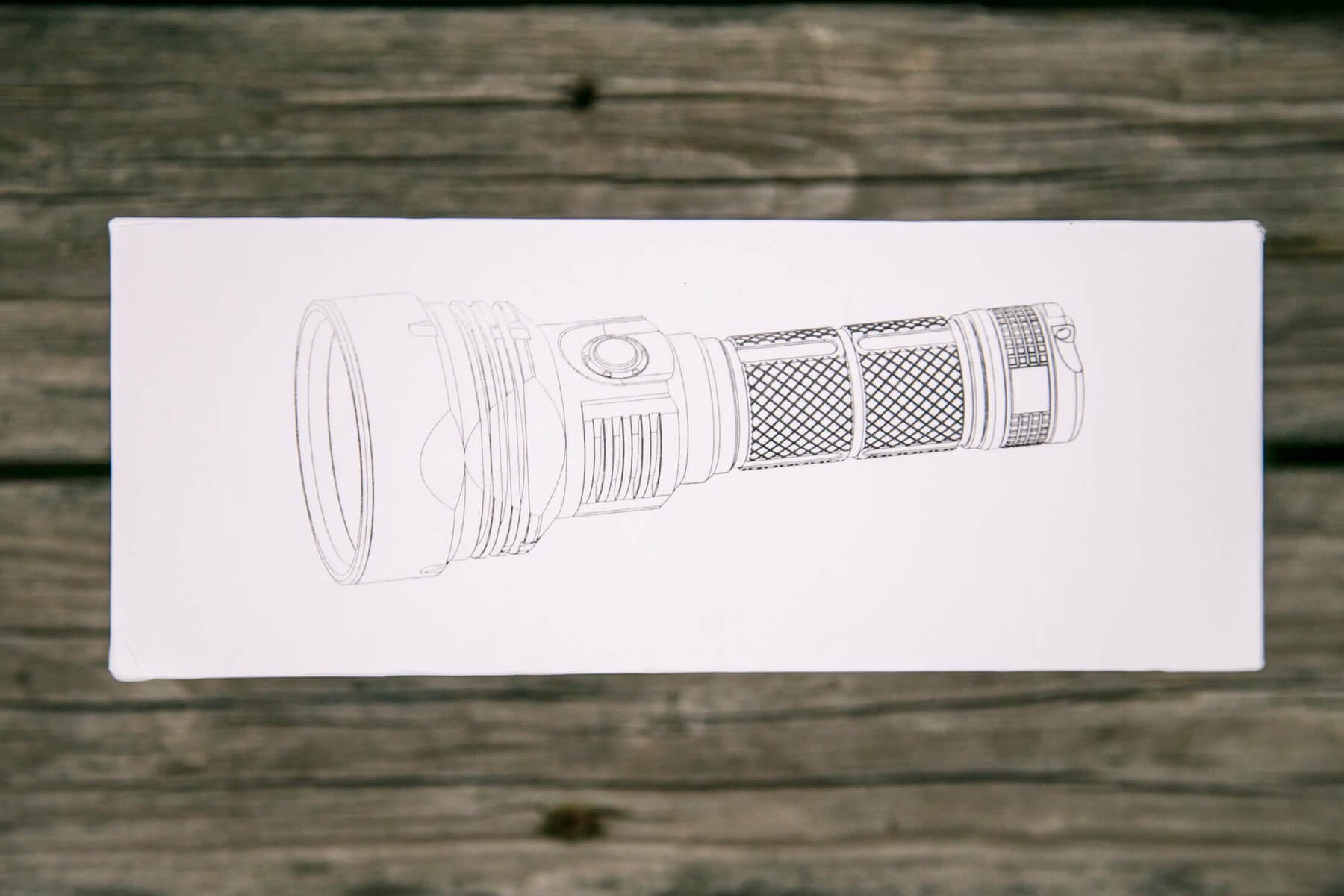 The box is a common Astrolux box. A photo is silver embossed on the front, and the short end has a light-specific sticker, too.