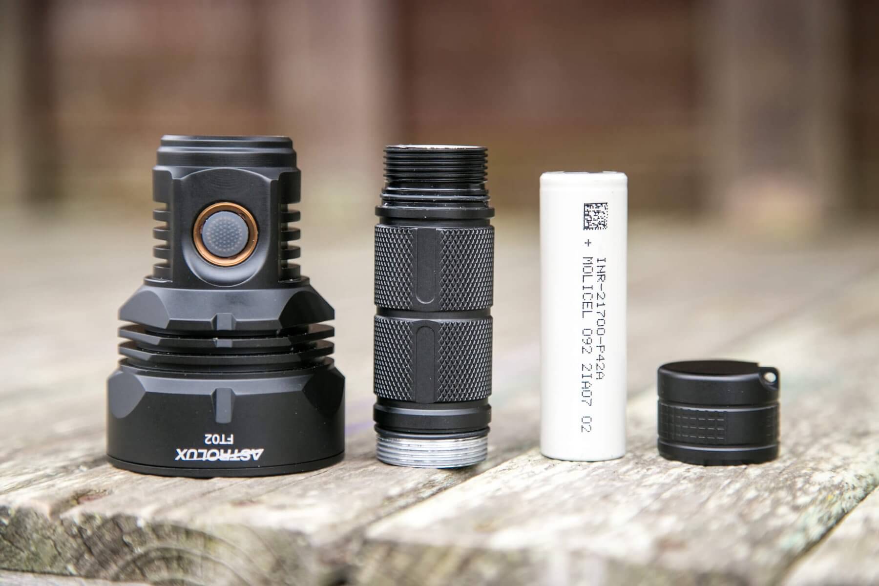 Taking the light apart minimally, you can see that the cell tube is removed fully from the body. For scale (not included) is a Molicel 21700 (reviewed here).