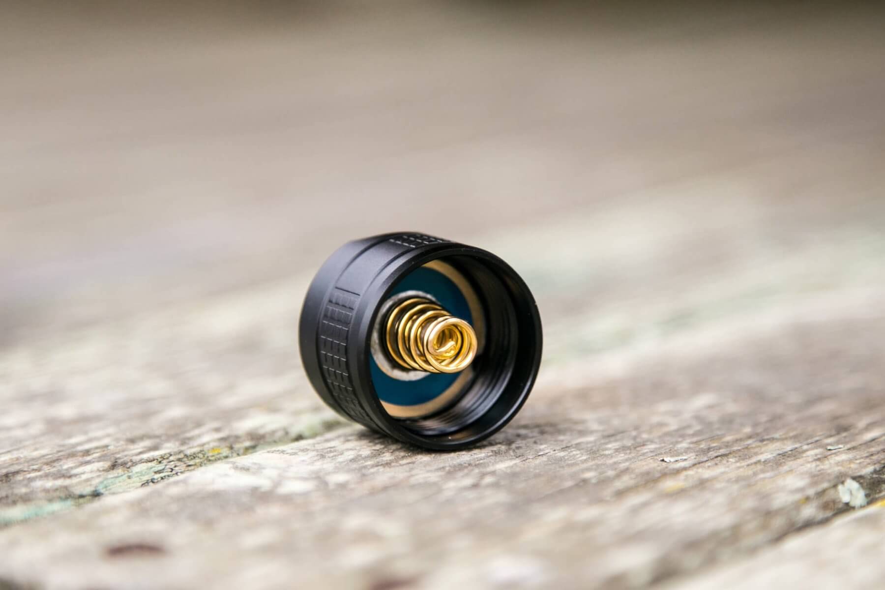 The tailcap has a big, thick, and double spring – very thick and lots of spring. The head does not have a spring at all, but has a broad brass button.