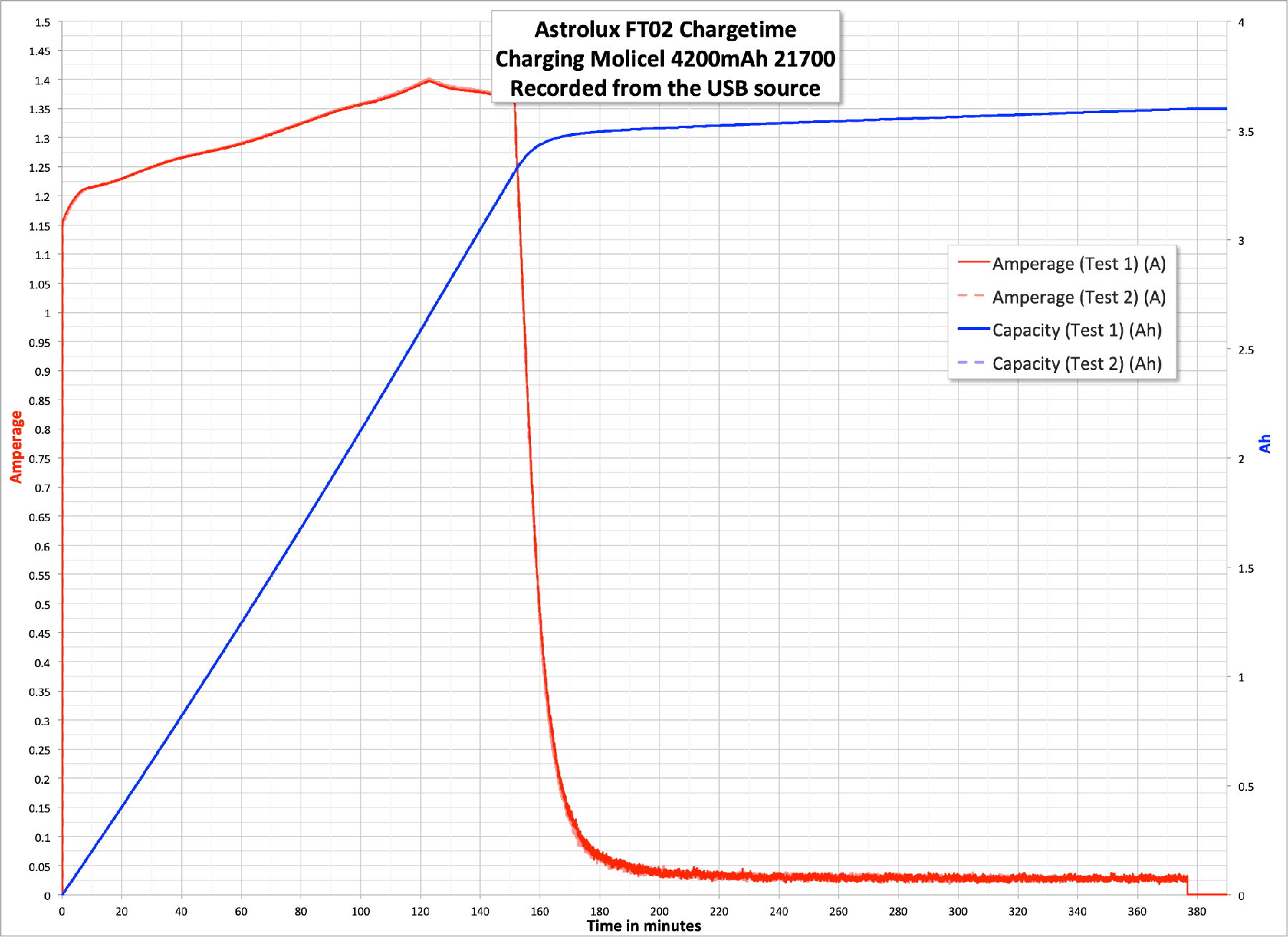 Below are two charge tests. Yes, two – the tests are so reliable that they overlap almost exactly. Charging is decent at around 1.3A during CC. The CV phase takes quite a long time to finally terminate, but charging does shut off completely when the cell reaches 4.2V.