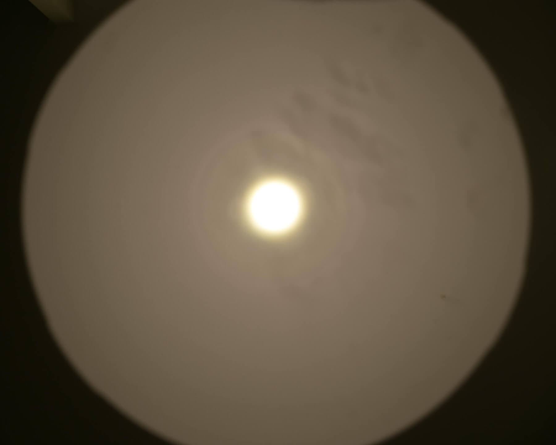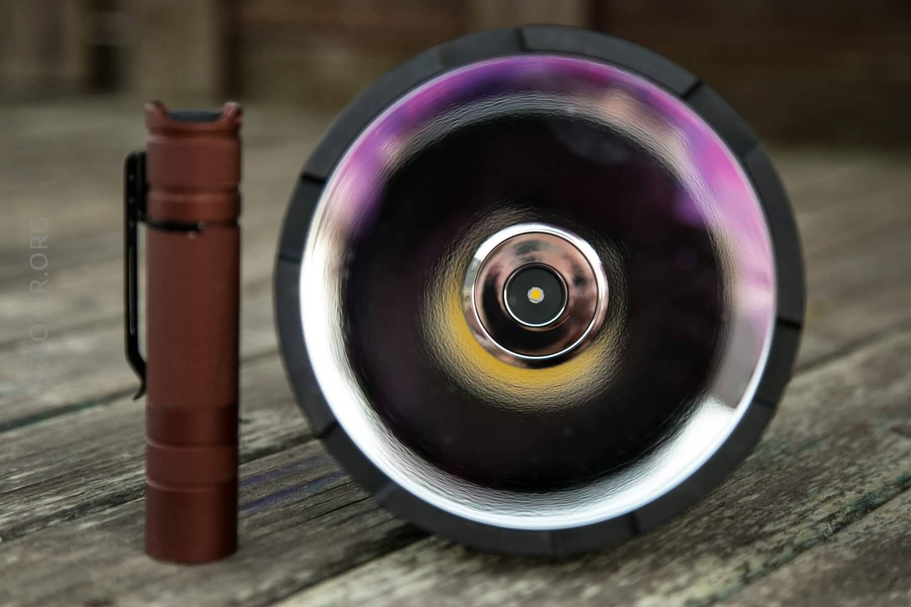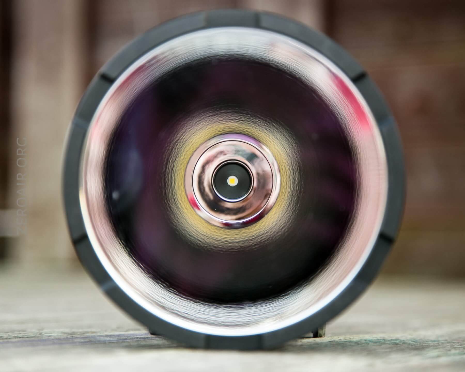 The emitter sitting deep within this big ol smooth reflector is a Cree XHP35 HI. That’s the thrower of choice in my opinion and a wonderful choice for this light. It’s even neutral white, which proves that this is a community-driven light. (If it was manufacturer only, it’d certainly be CW, so they could pump out just a few more lumens, and a few more meters). The reflector is smooth with whatever it is the photo shows off below. Not really even enough to call it orange peel, but there’s a bit of wave going on, anyway.