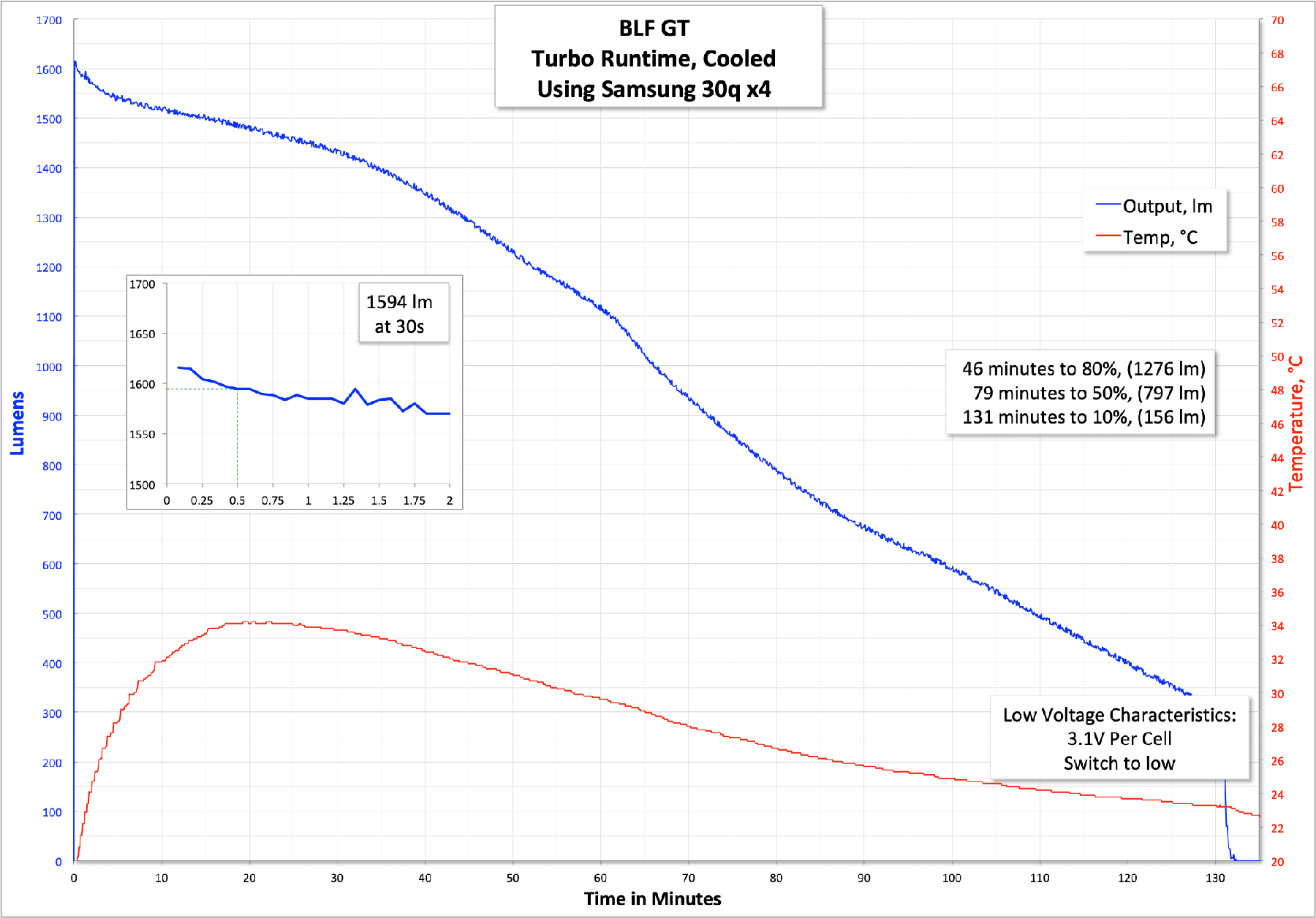 I used Samsung 30q cells (real ones, not fake ones), though it’s overkill for this light – the GT doesn’t need extremely high drain cells. (In fact, the cells that were options for the original group buy were Samsung 35Es, a high-capacity, lower-drain cell.)