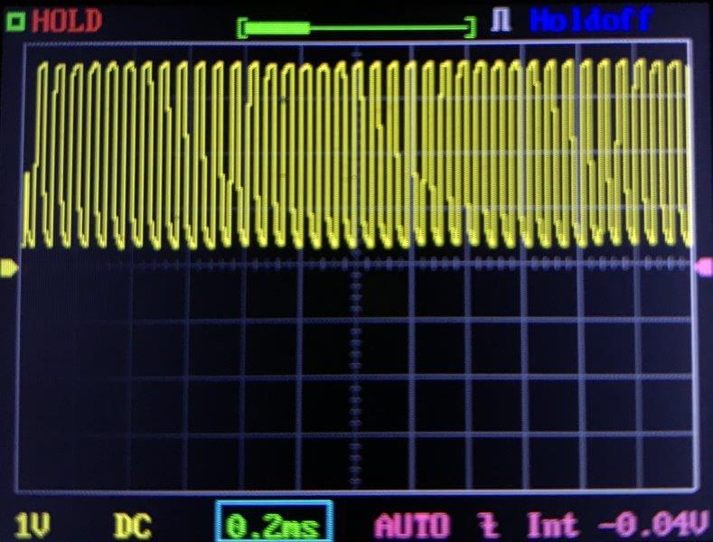Then there’s the Ultrafire WF-602C flashlight, which has some of the worst PWM I’ve seen. It’s so bad that I used a post about it to explain PWM! Here are multiple timescales (10ms, 5ms, 2ms, 1ms, 0.5ms, 0.2ms) to make comparing this “worst” PWM light to the test light easier. That post also explains why I didn’t test the WF-602C at the usual 50us scale.