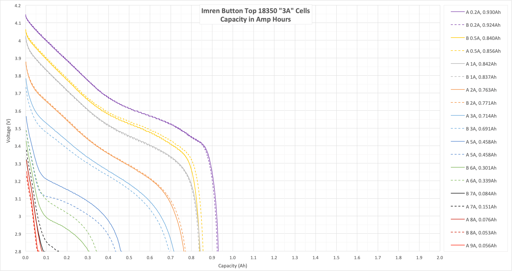 These cells are rated at 800mAh, and as the tests show, easily surpass that. Even up to 1A discharge (much higher than the usual 0.2A spec for LiIon cells, though this cell doesn’t have a datasheet), the cell still provides over 800mAh.