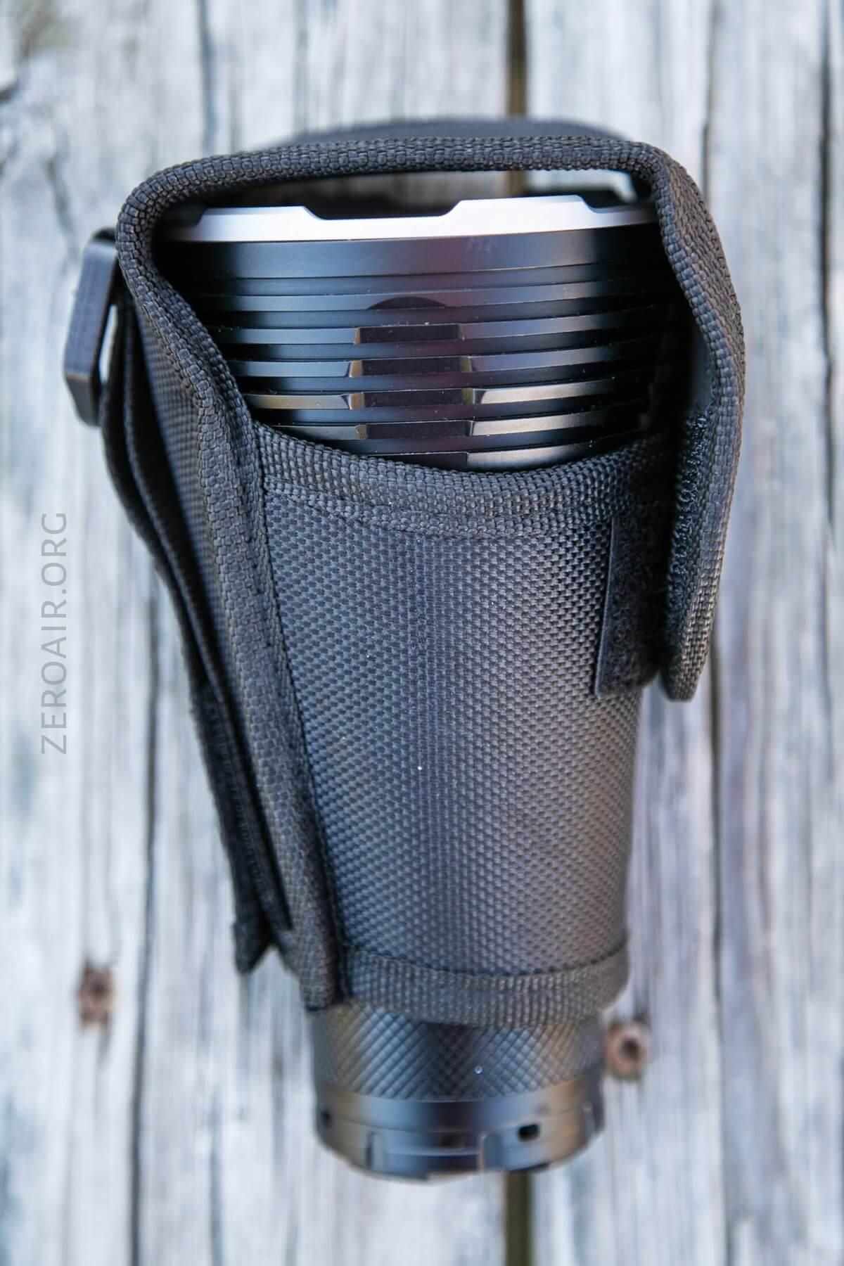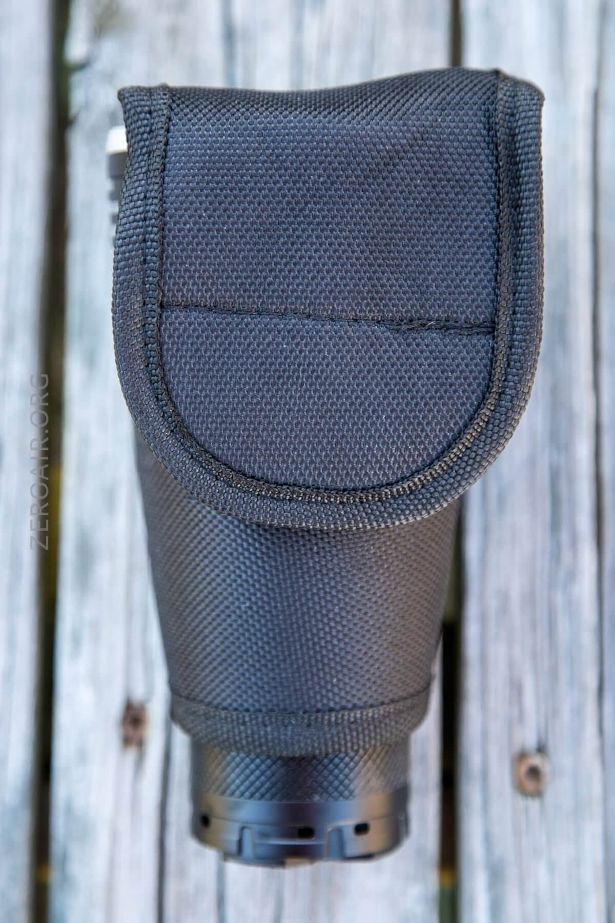 Imalent includes a directional nylon pouch. The bottom is open, and the light hangs out a little. The straps are double, with one being velcro and detaching at the bottom.