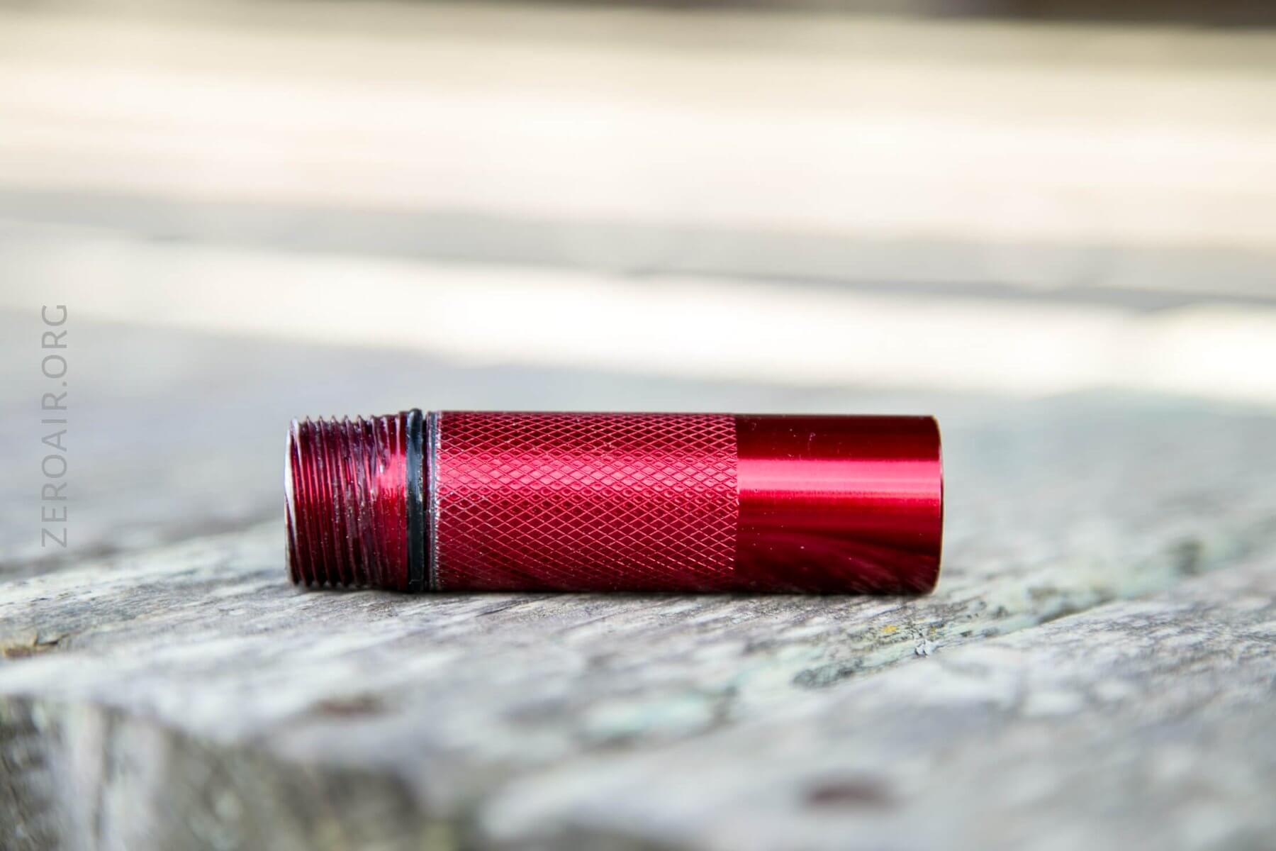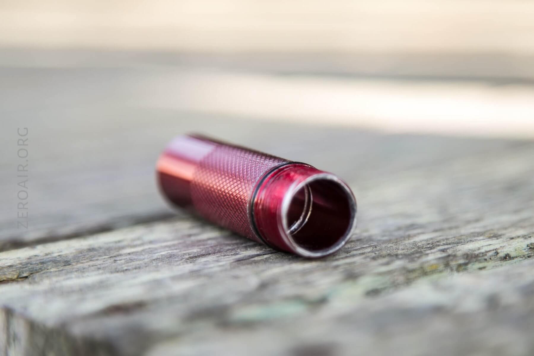 Here you can see where the work is done. The threads at left are the normal “twisty UI” threads and are as-stock. The body at right is also as-stock. The difference is just to the right of the o-ring. The cell tube has been cut at that point, bored a bit, and the thread end (to the left) has been fitted into the body. That’s how the end pieces are kept, while still shortening the tube. IE, the length is removed from the middle of the tube!!