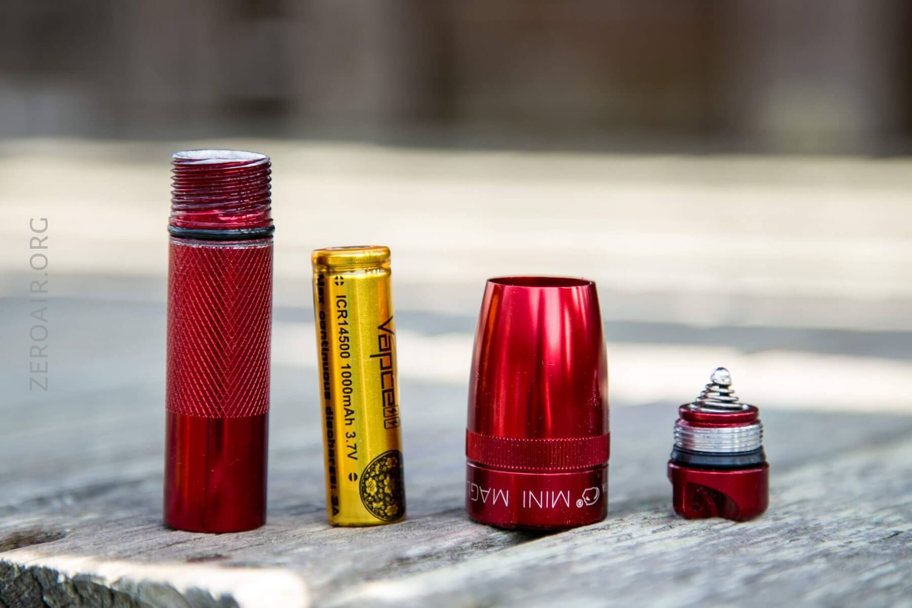 Every iteration of this light will likely be a little different. The copy I borrowed was a Nichia 219b light, and mine isn’t. So there are many versions, but generally any Micromag color is available (“generally”), and the internals all use the same driver, and accept only 14500 cells.