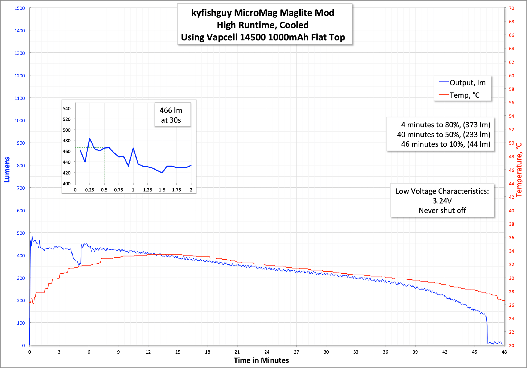 (Reading up on this light and seeing my results, I think I’ll try to find my best 14500 and test the light again with that cell. I’m not at all satisfied with this cell for this light.)