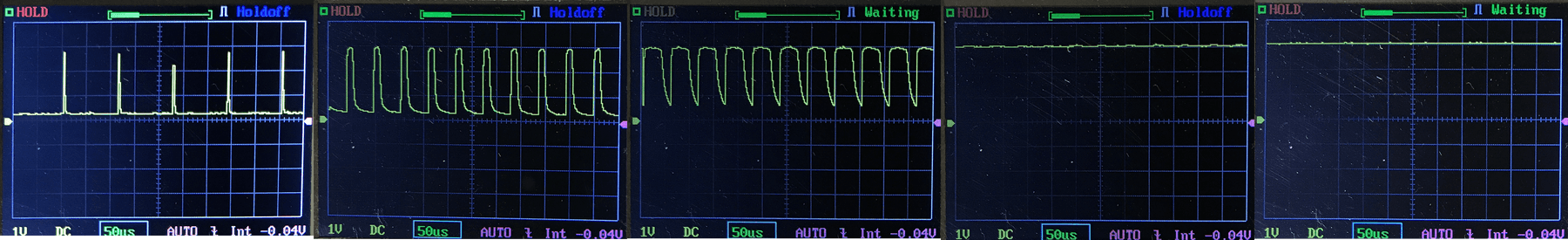 This is a four-mode light, and all but Turbo use PWM for controlling output. There are 5 pictures here, though. Why? Picture 3 and 4 are all of mode 3 (second highest mode). The part displaying PWM is when the light isn’t shined directly at the sensor. When shined directly at the sensor, the PWM appears to disappear. It’s not noticeable of course, but it’s there.