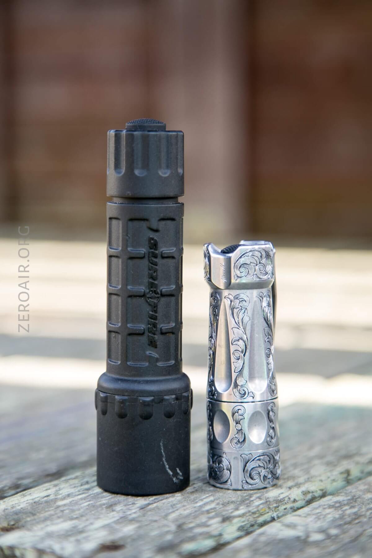 And here’s the light beside my custom-engraved TorchLAB BOSS 35, an 18350 light. I reviewed the aluminum version of that light in both 35 and 70 formats.