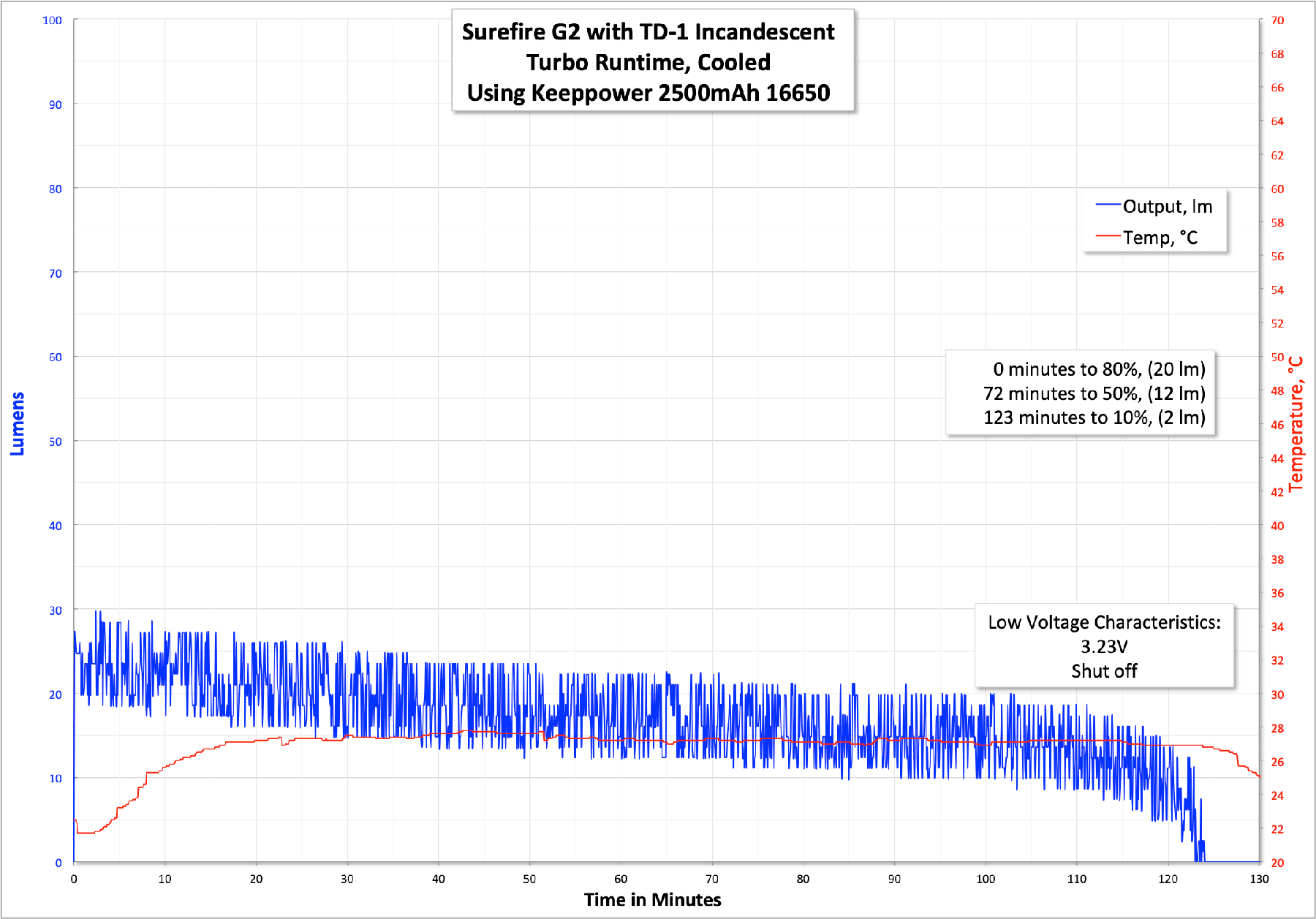 Output is very low. But more interesting than that, is something that we can infer from this run. Based on this runtime, it’s possible to understand just how much more efficient LED emitters are. A shutoff after 2 hours of only 25 lumens or so means that so much of the energy from the cell went to waste heat! A led makes heat, but just about any current generation [flashlight], LED could make 25 lumens for ages.