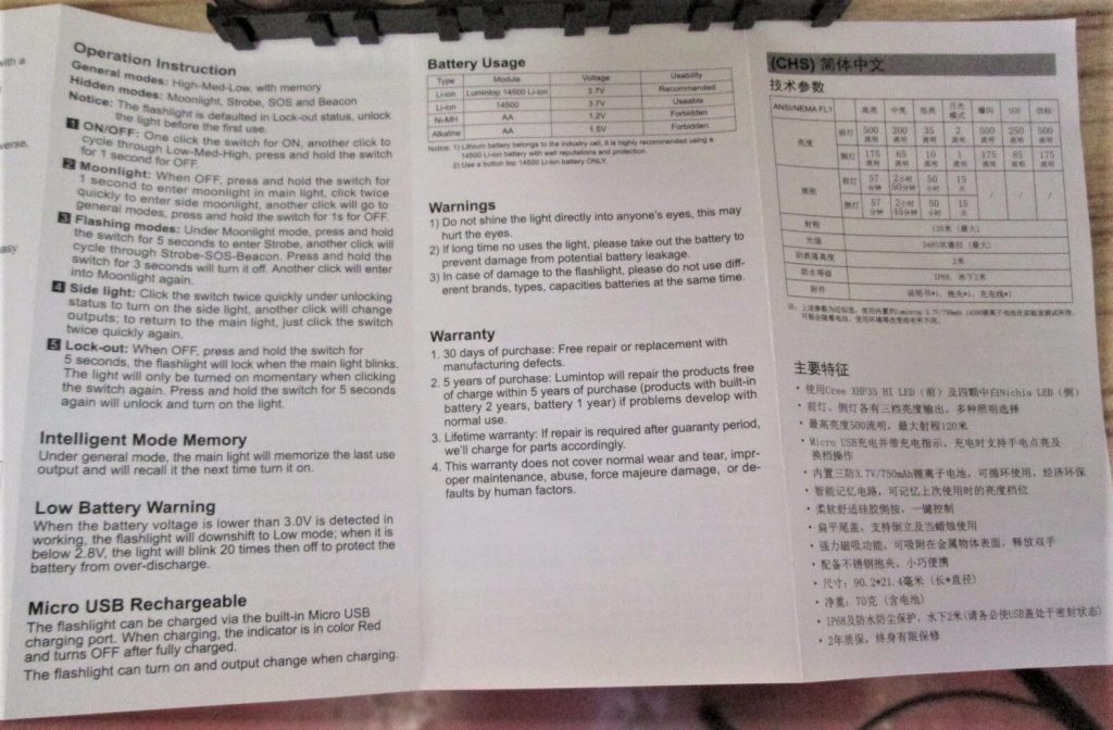 ^ Measurement disclaimer: Testing flashlights is my hobby. I use hobbyist-level equipment for testing, including some I made myself. Try not to get buried in the details of manufacturer specifications versus measurements recorded here; A certain amount of difference (say, 10 or 15%) is perfectly reasonable.
