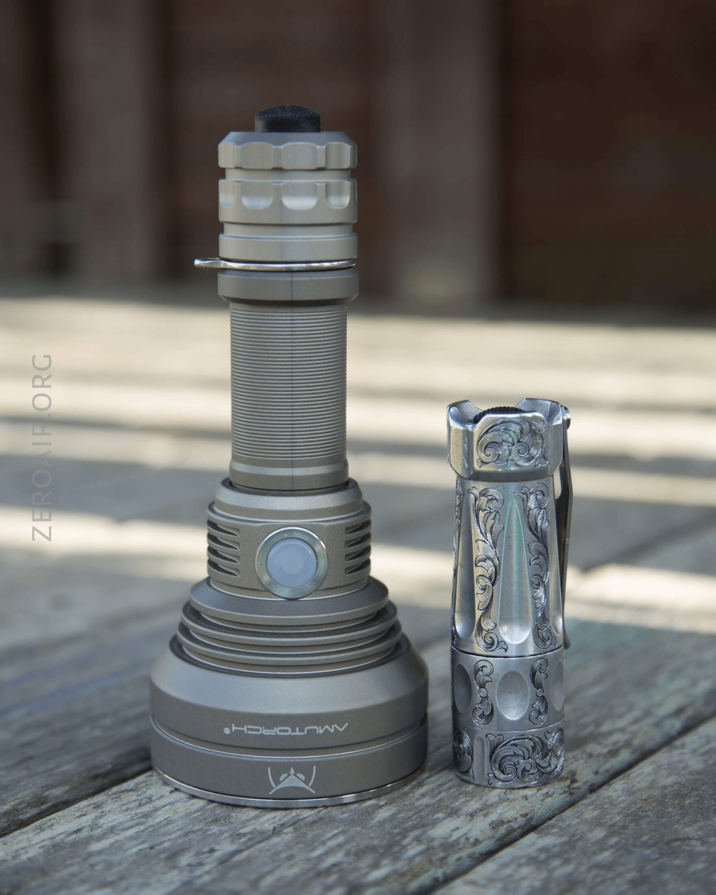 And here’s the light beside my custom-engraved TorchLAB BOSS 35, an 18350 light. I reviewed the aluminum version of that light in both 35 and 70 formats.