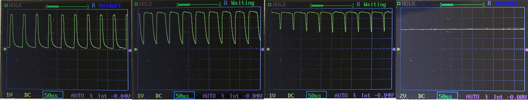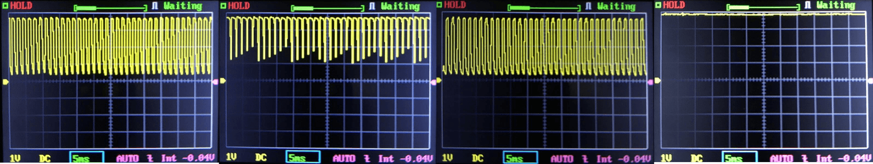 Then there’s the Ultrafire WF-602C flashlight, which has some of the worst PWM I’ve seen. It’s so bad that I used a post about it to explain PWM! Here are multiple timescales (10ms, 5ms, 2ms, 1ms, 0.5ms, 0.2ms) to make comparing this “worst” PWM light to the test light easier. That post also explains why I didn’t test the WF-602C at the usual 50us scale.