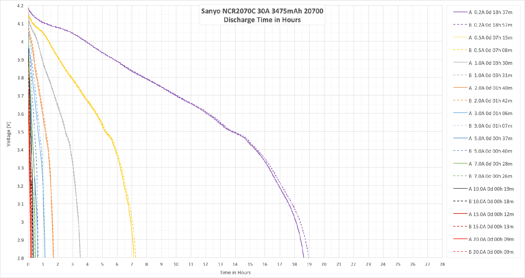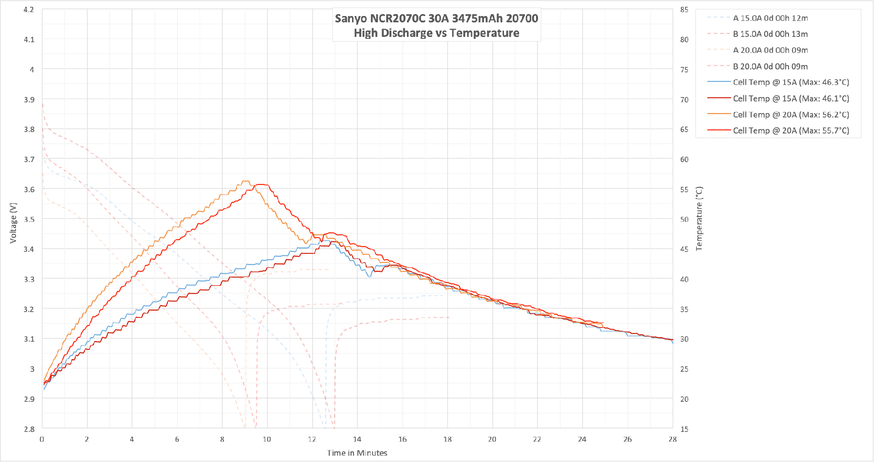 Here is why I think it is so interesting about “Bounce.” A poorly performing cell will bounce back higher after high discharges. That’s because the IR is higher, and because the cell performs much worse under high loads. So a good-performing cell will bounce back much less because it’s much more capable of high discharge. At high discharge on a capable cell, more of the energy makes its way out of the cell! Hence less bounce.