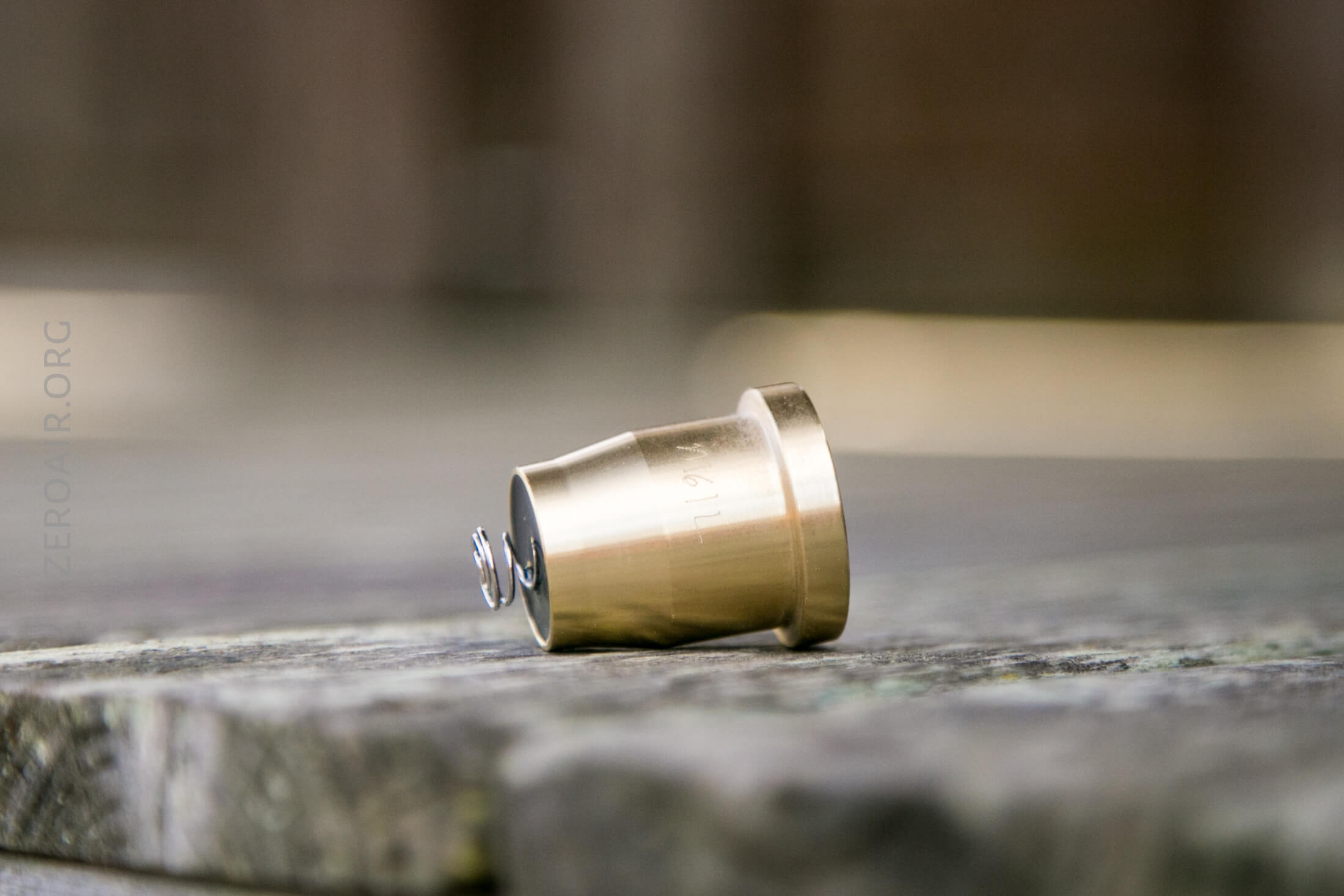 A small brass cylinder with a coil spring inside rests on its side on a weathered, multicolored wooden surface.