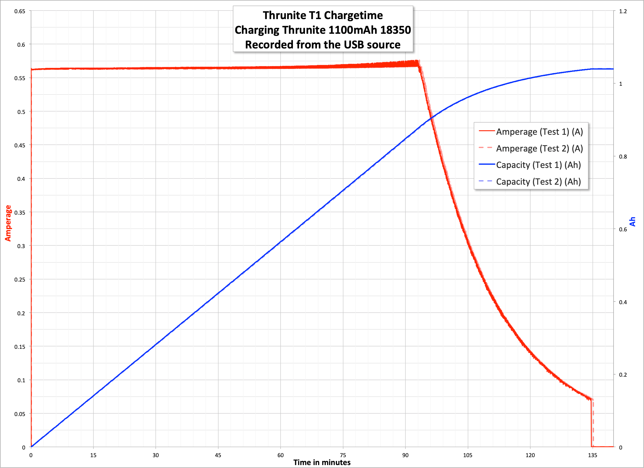 Both charge tests proceeded at around 0.57A, and also confirm that the cell is indeed around 1100mAh (remember, this test is recorded from the USB source at 5V, not 4.2V like the cell). Charging takes just over 2 hours. During charge, the indicating switch is red. After the cell is charged, the switch is blue.