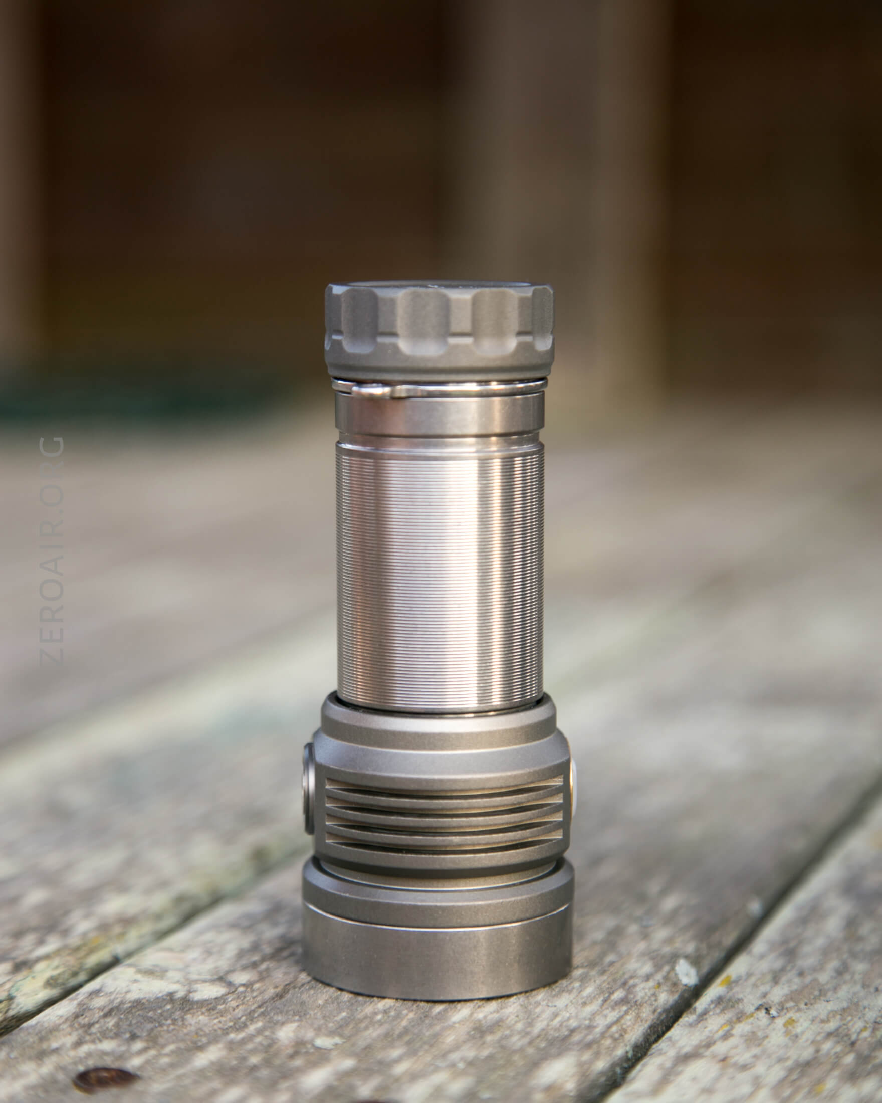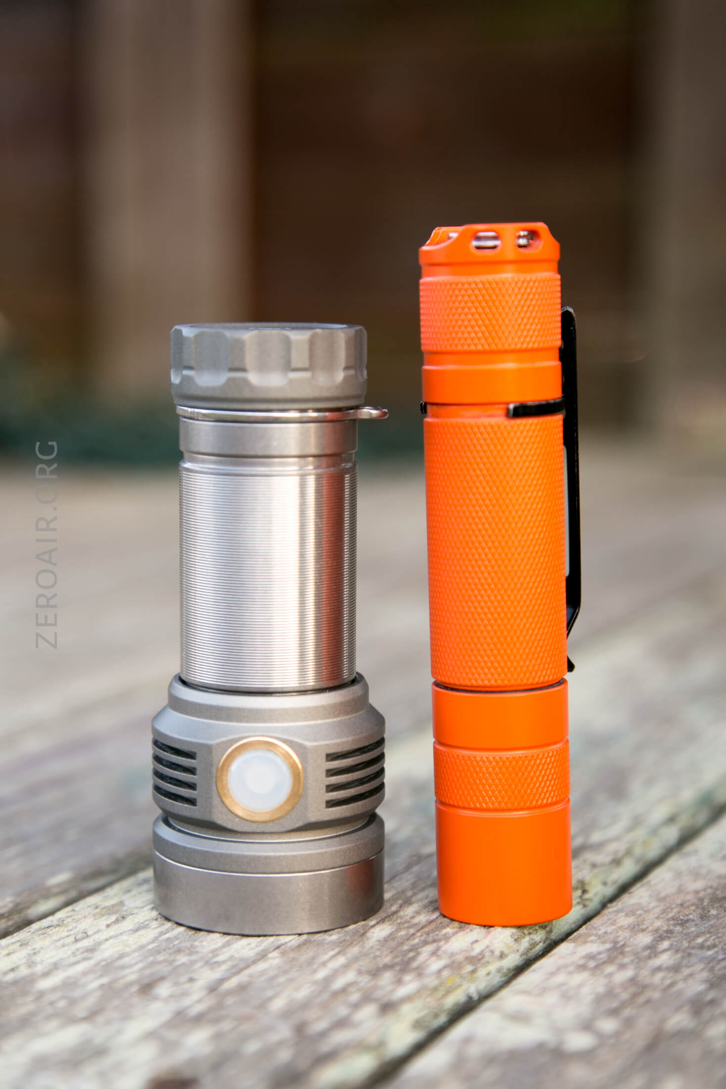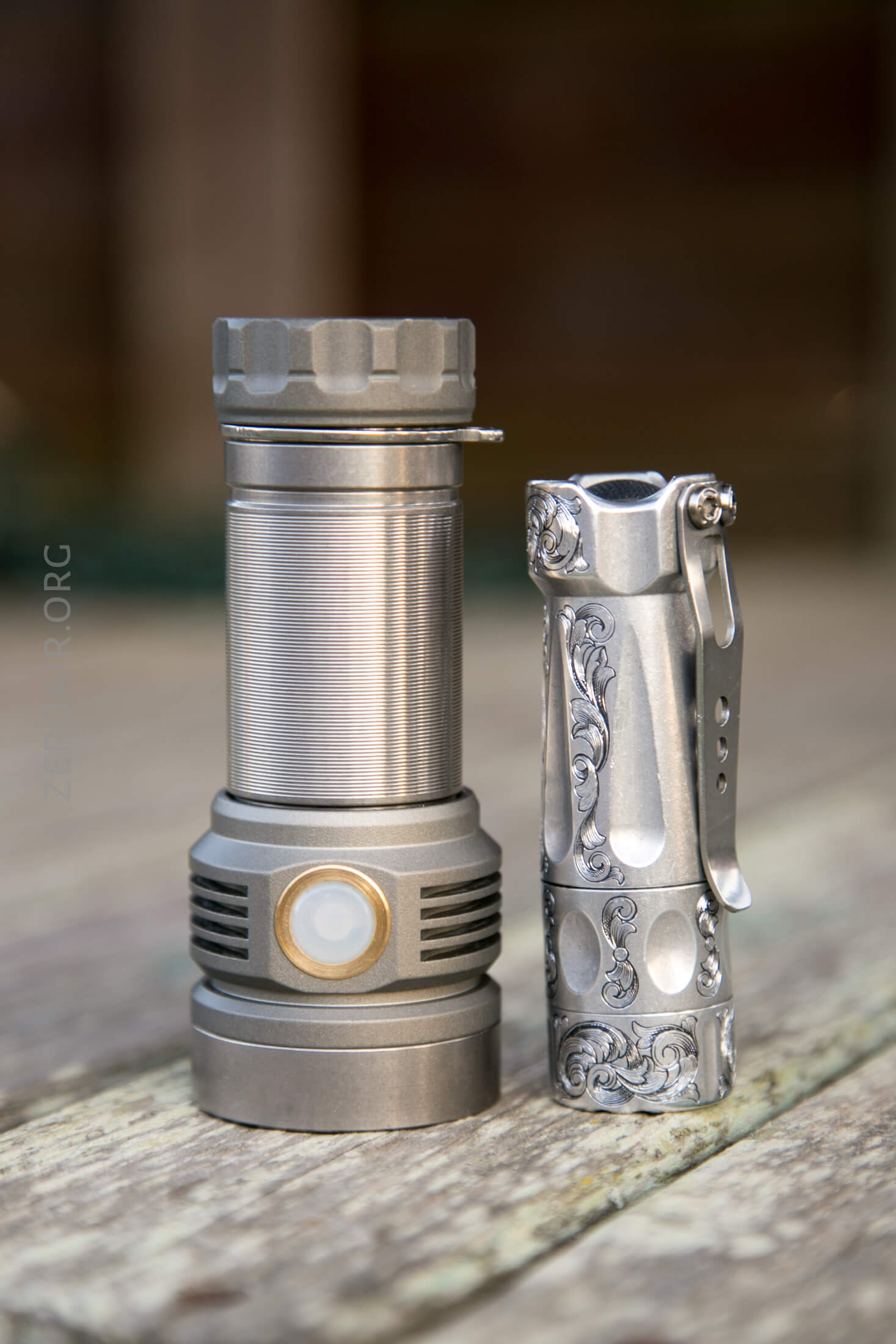 And here’s the light beside my custom-engraved TorchLAB BOSS 35, an 18350 light. I reviewed the aluminum version of that light in both 35 and 70 formats.