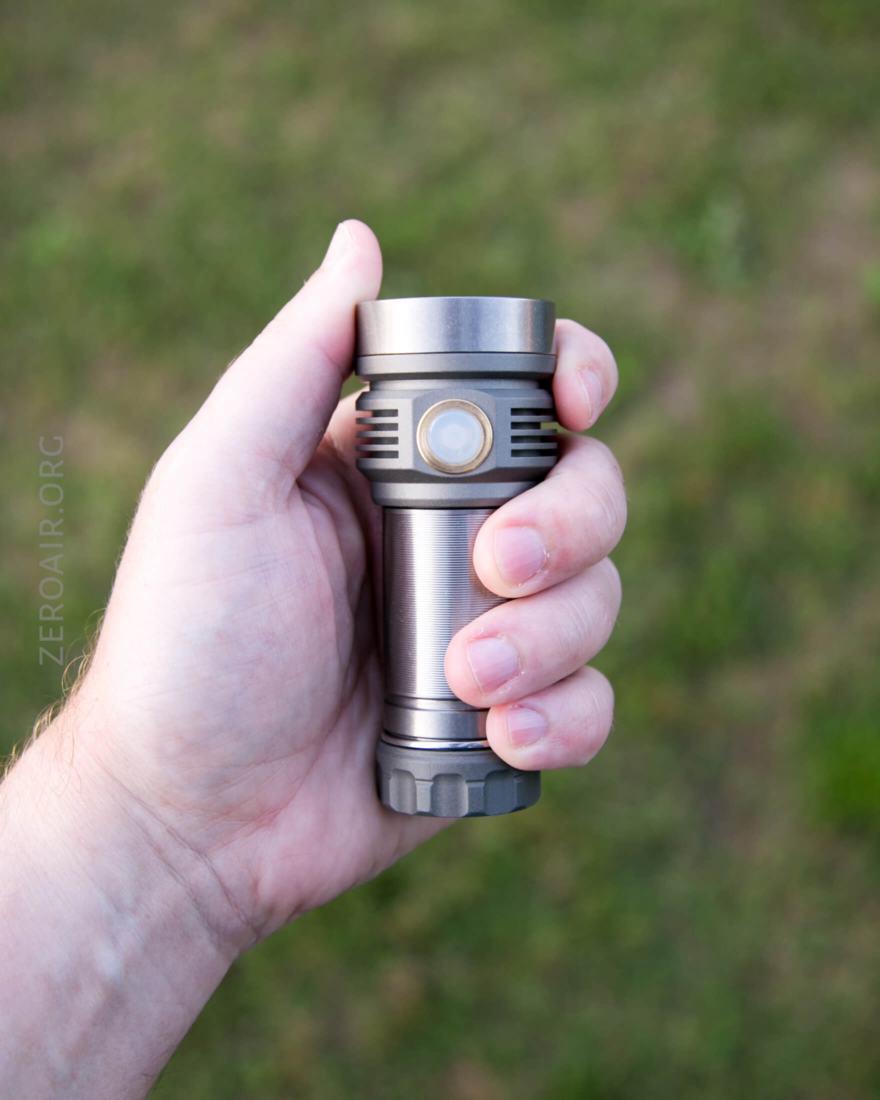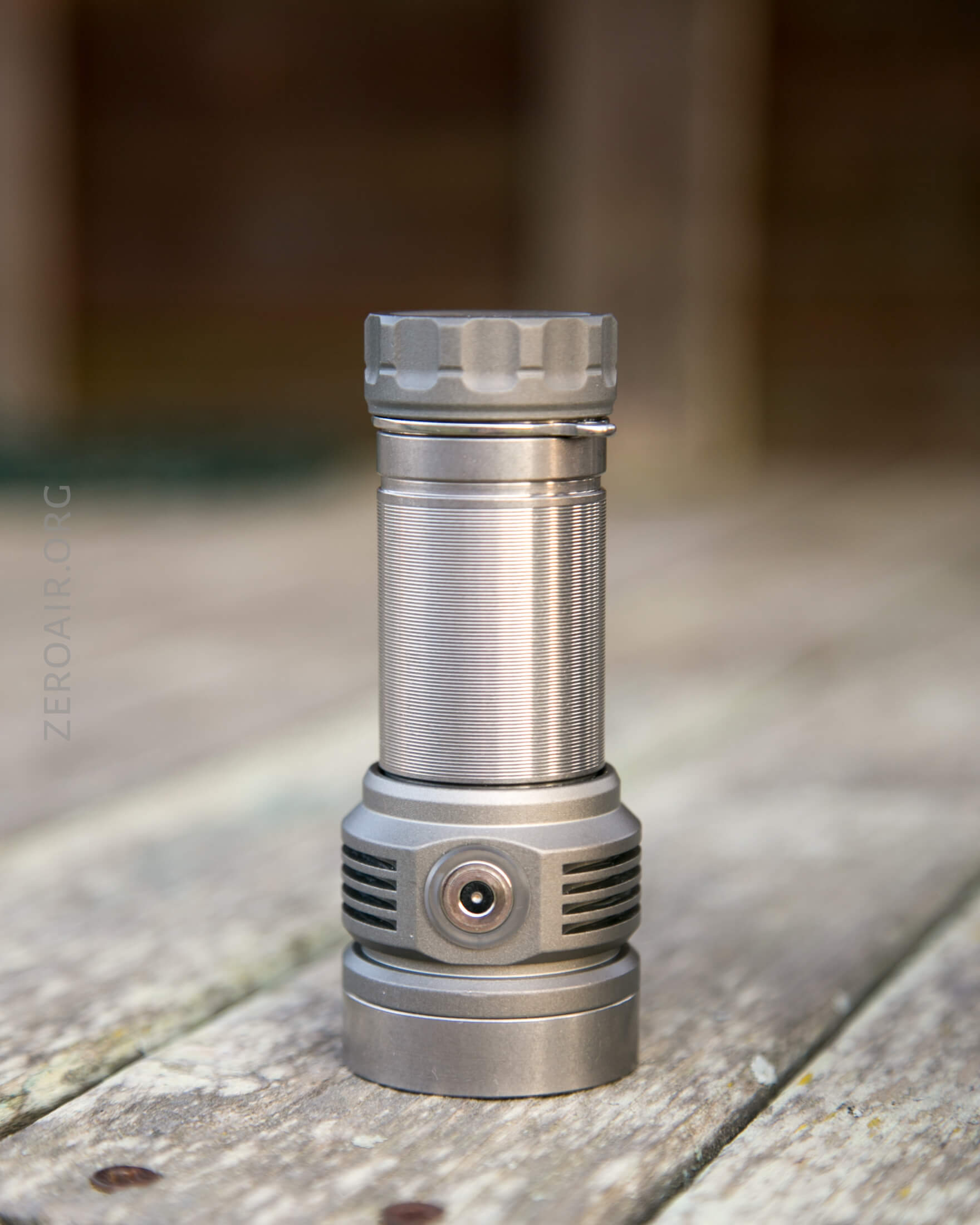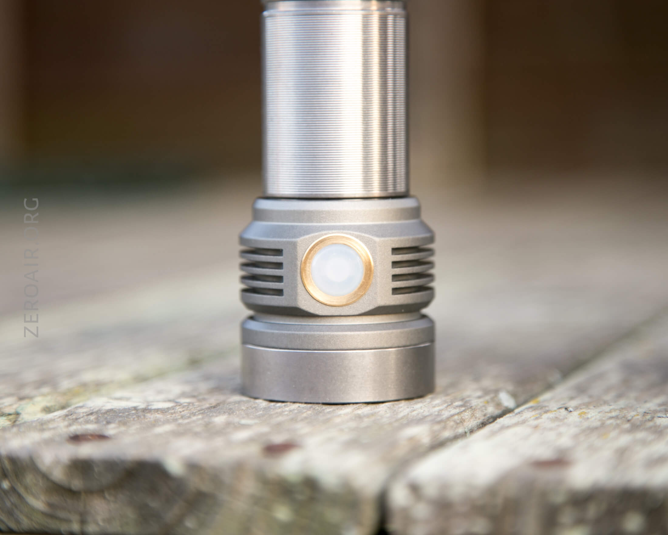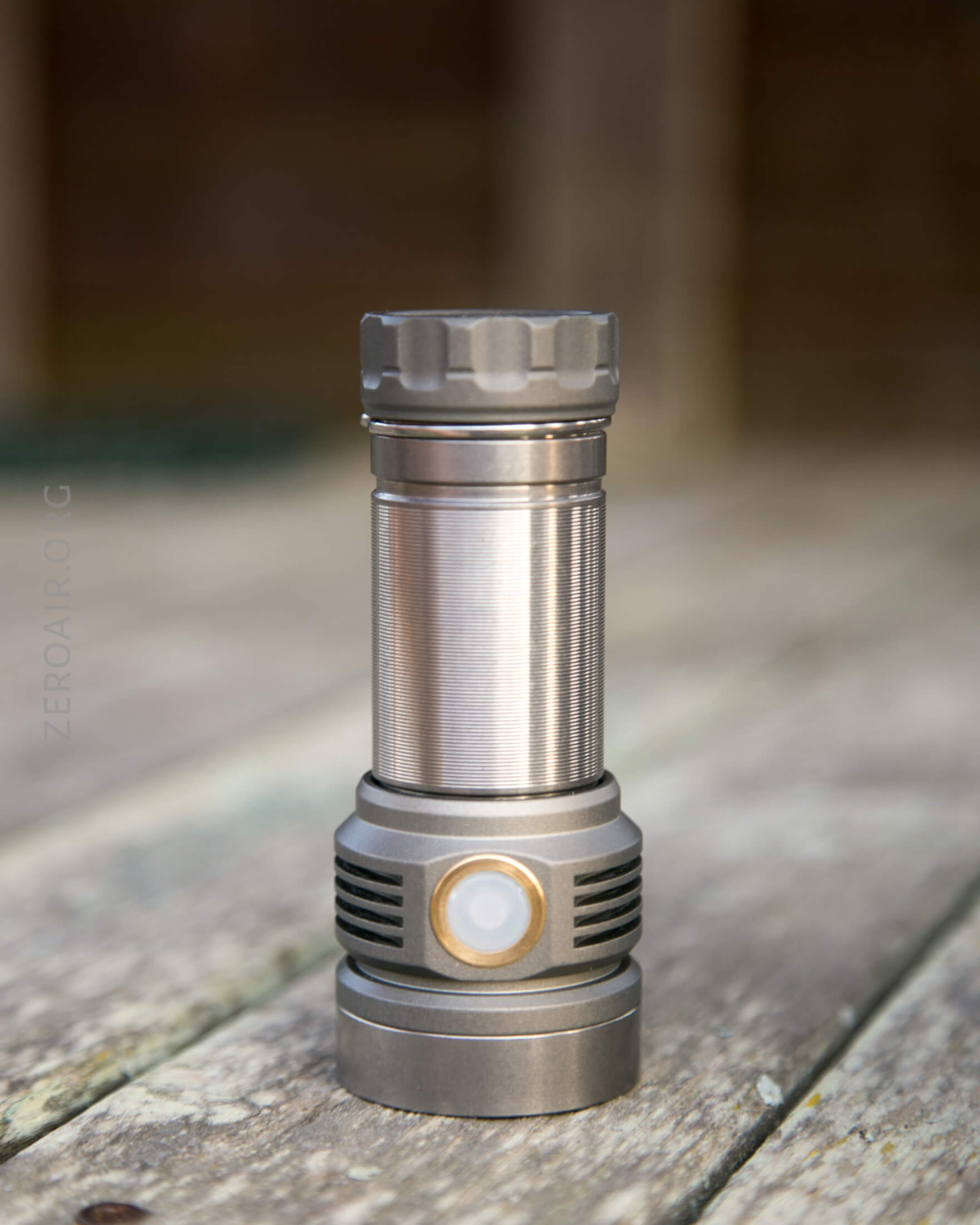 And here’s the light beside my custom-engraved TorchLAB BOSS 35, an 18350 light. I reviewed the aluminum version of that light in both 35 and 70 formats.