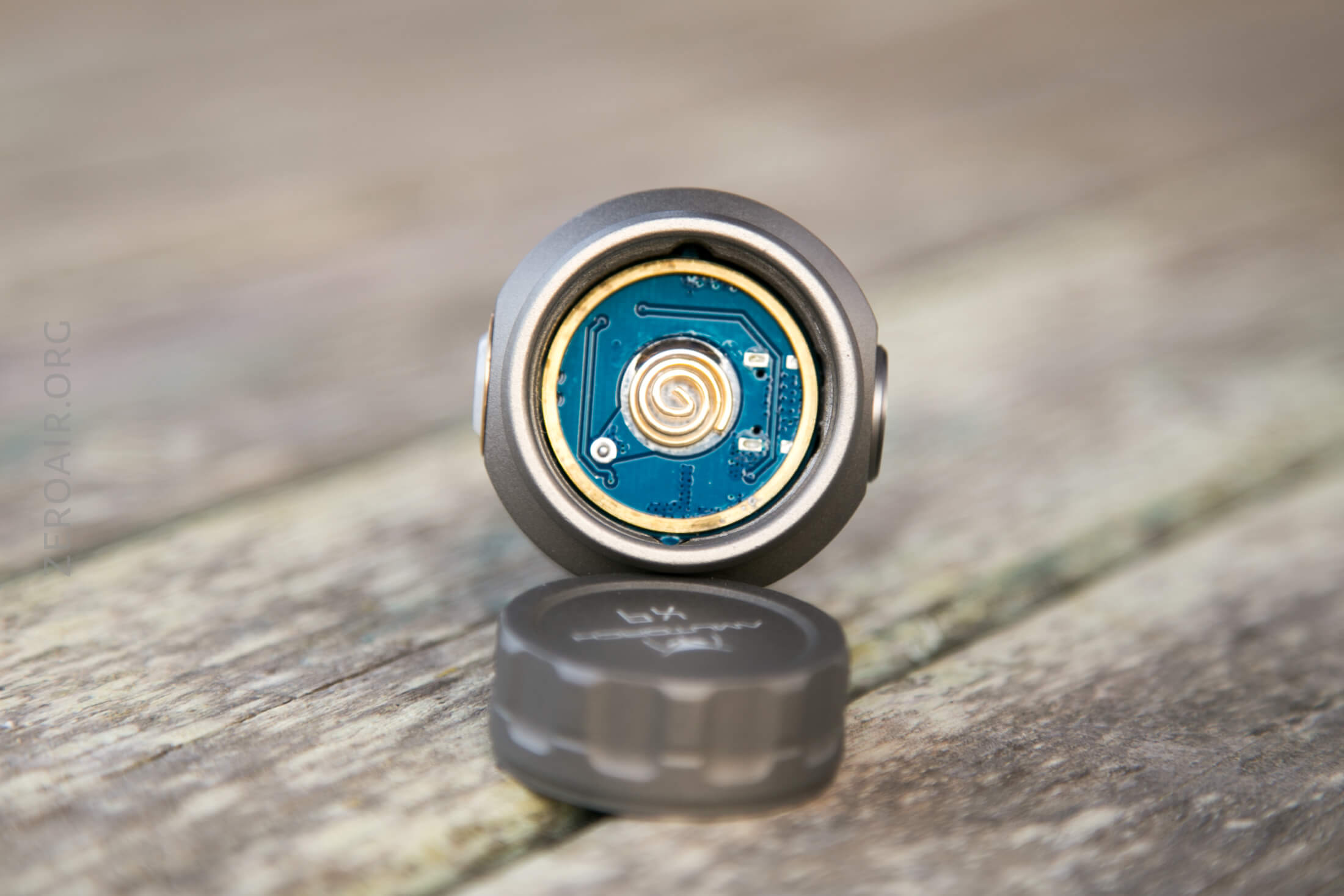 Both the head and tail have very short, gold-plated, stiff, springy springs. The brass-looking ring on both the head and tail is actually a brass ring (not a layer on the MCPCBs).