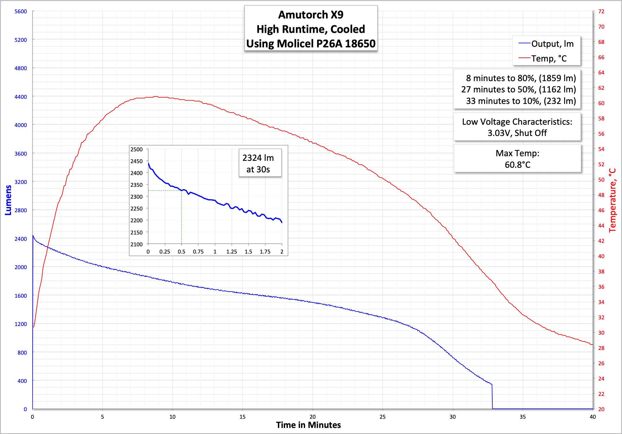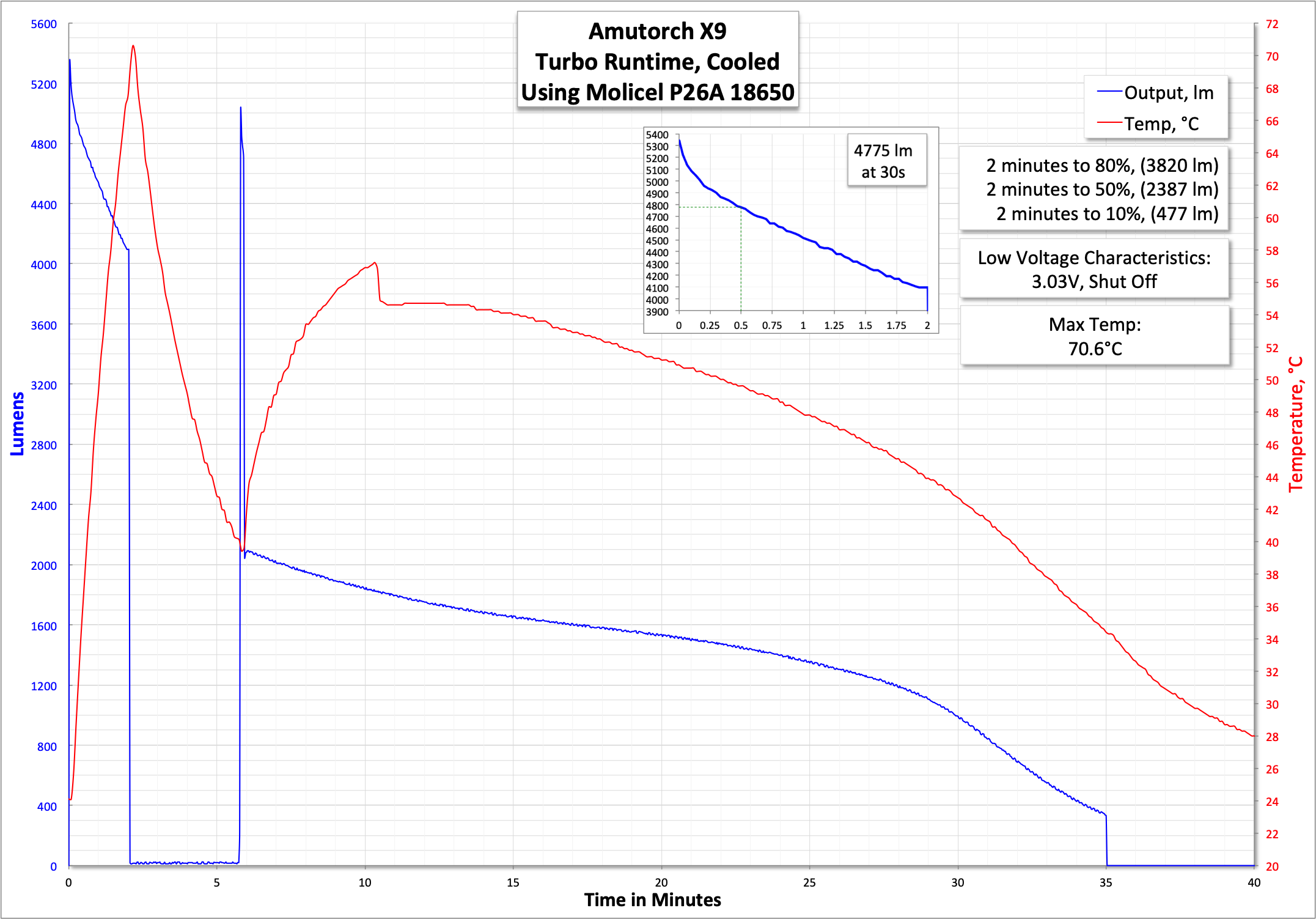 Here’s the runtime on Turbo. At 2 minutes, I manually shut off the light. Note the temperature (and the primary reason I will not recommend this light). It seems that the light is essentially a direct drive with no step-downs and no regulation. At over 5000 lumens, for 2 solid minutes (drifting downward with cell voltage, of course), this thing makes some heat! Over 70°C when I shut the light off. That’s absolutely too hot to hold, and was just about too hot to even touch. I let the light cool (fan-cooled runtime!) for a few minutes, and then restarted on turbo – the light stepped down quickly, and though the temperature still goes higher than lights usually do, it stayed within a safe range.