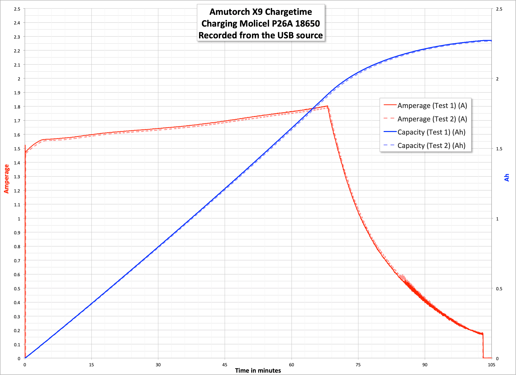 Charging works quite well, seeing over 1.5A for the whole CC phase, and charging this 2600mAh 18650 in well under 2 hours. (Yes, at peak current, that’s a little high for the average 18650, but ok once in a while. For 26650 cells, this should be a good charge rate.)