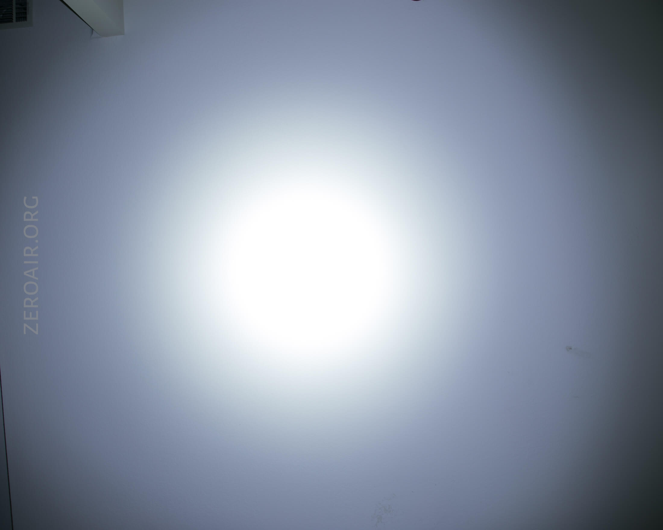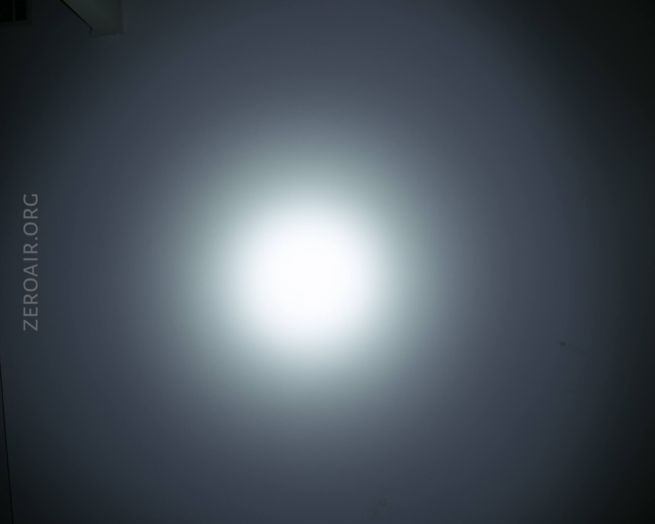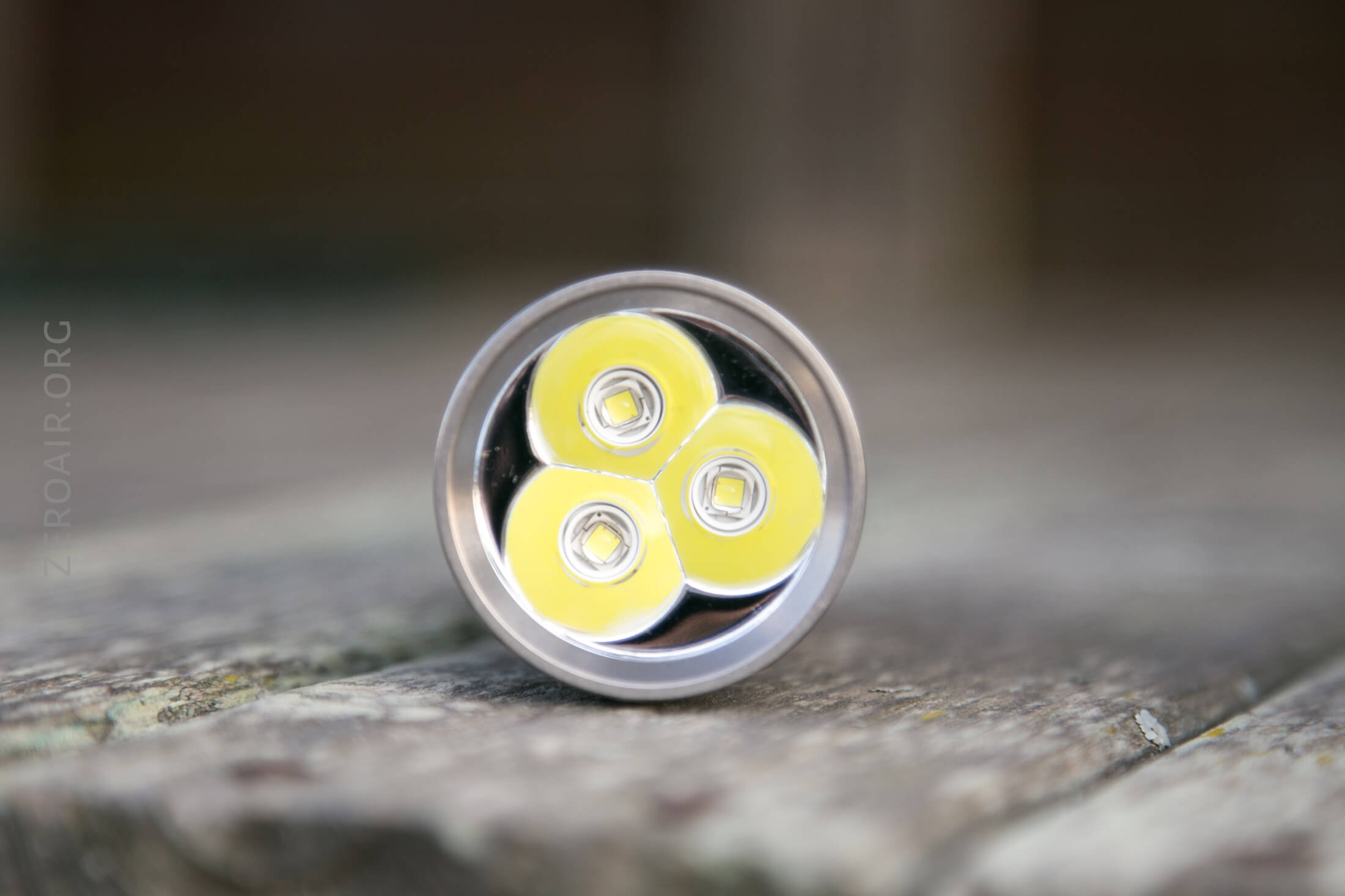 The emitters here are Luminus SST-40. There are three of them, which makes this a triple but not a traditional triple – each emitter has most of a reflector to itself. The beam is surprisingly well focused, and the three appear as one in the beam. The reflectors are smooth, and the beam has a hotspot with a bunch of spill, too.