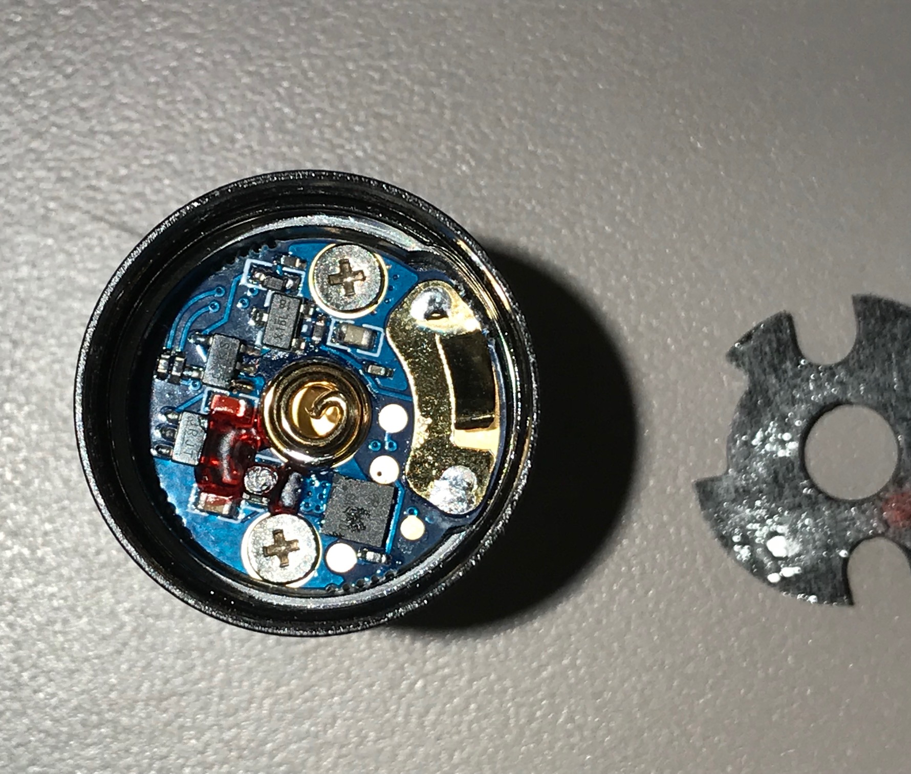 The tail has a spring, and also due to the electronic switch in the tail, some electronic components, too. The head has a thin spring, and also what looks like potting, but this seems to be more of a protective sticker than potting or conformal coating. It’s quite thick – around 1mm, and very flexible.