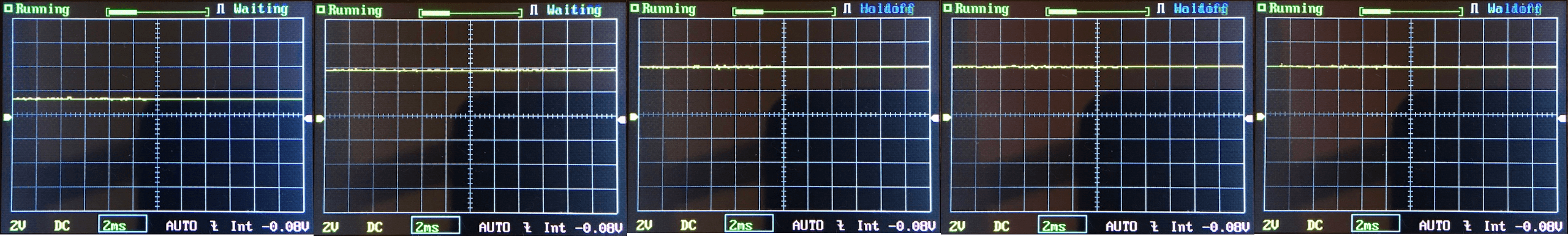 Then there’s the Ultrafire WF-602C flashlight, which has some of the worst PWM I’ve seen. It’s so bad that I used a post about it to explain PWM! Here are multiple timescales (10ms, 5ms, 2ms, 1ms, 0.5ms, 0.2ms) to make comparing this “worst” PWM light to the test light easier. That post also explains why I didn’t test the WF-602C at the usual 50us scale.