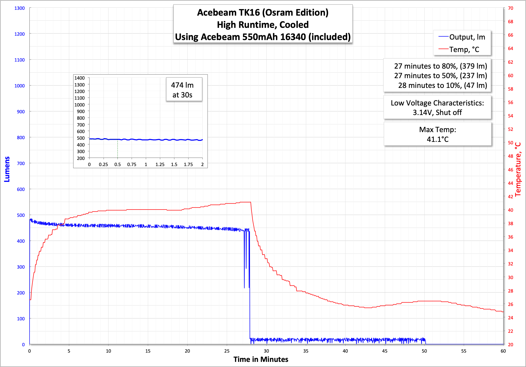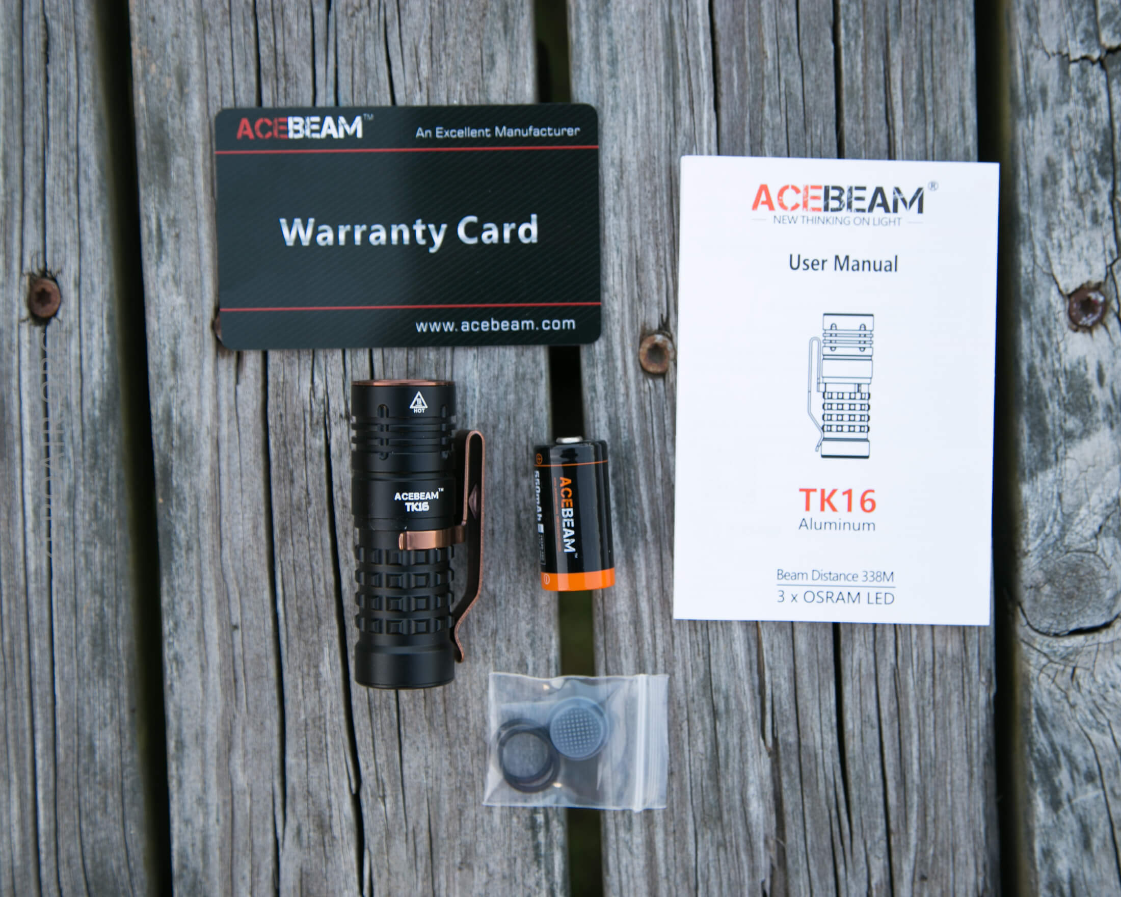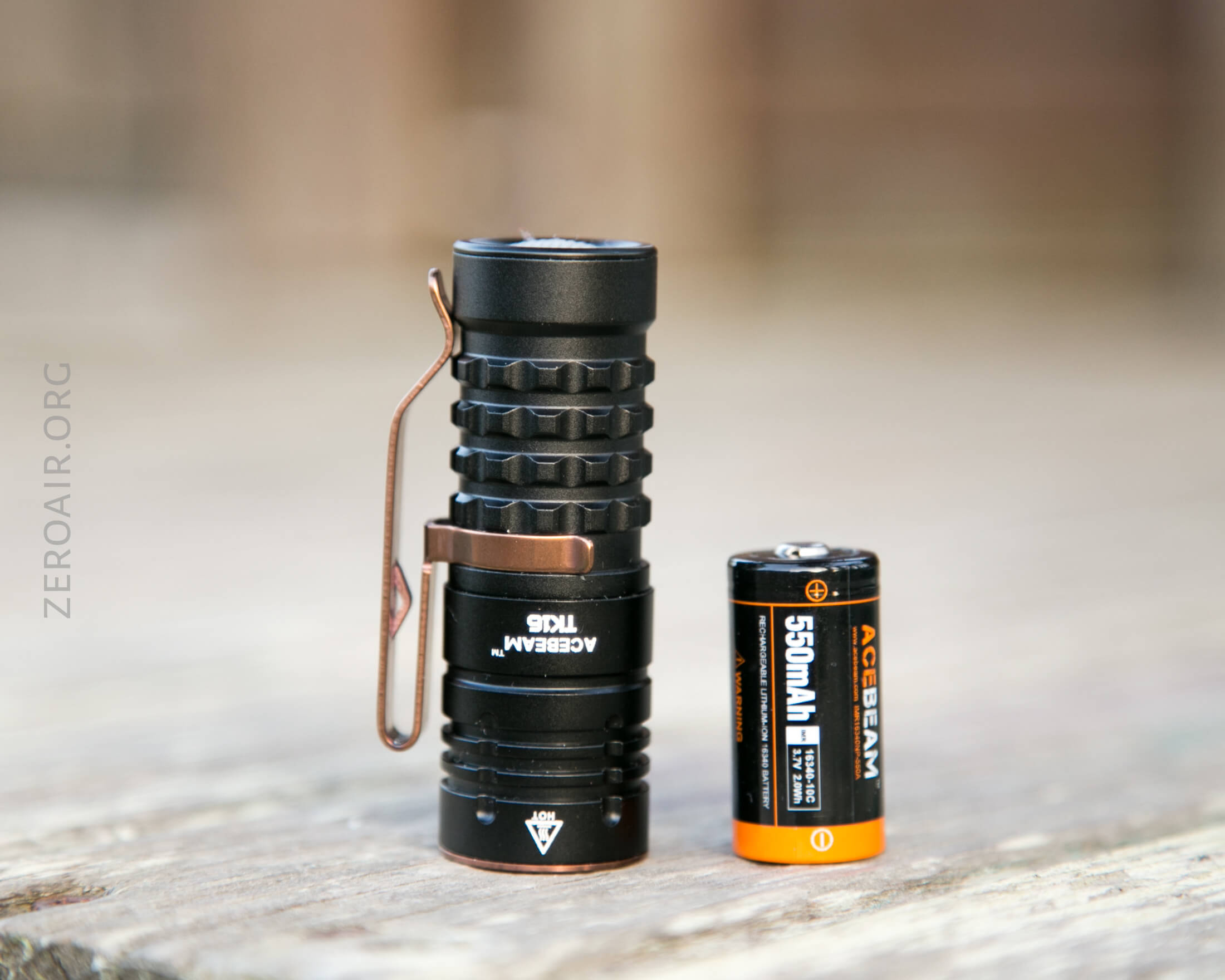 The TK16 (all models) is powered by a single 16340 cell. Acebeam includes a cell, which is 550mAh. It’s not specifically labeled as high drain, but I suspect it is.