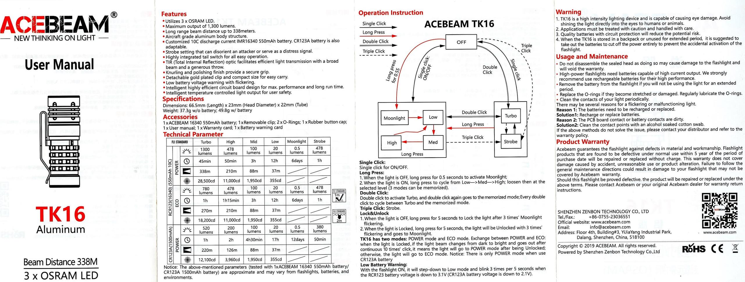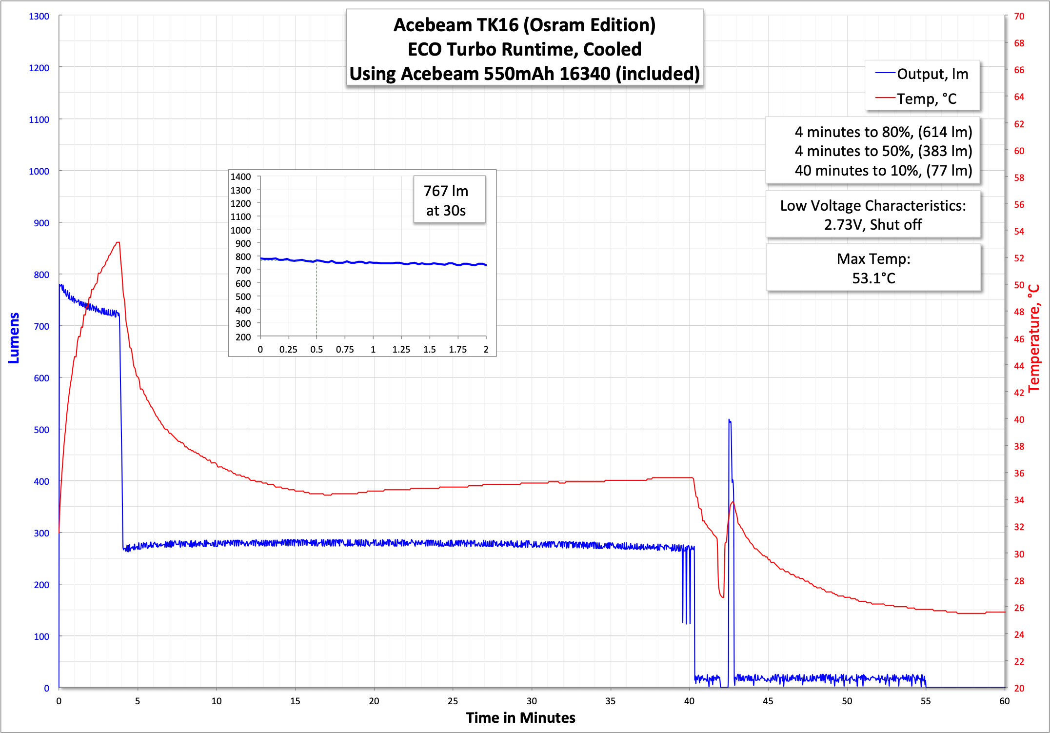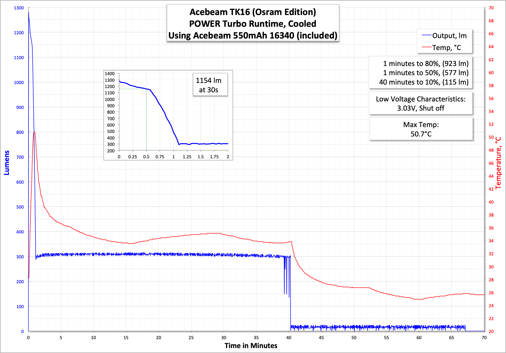 The TK16 (all models) is powered by a single 16340 cell. Acebeam includes a cell, which is 550mAh. It’s not specifically labeled as high drain, but I suspect it is.