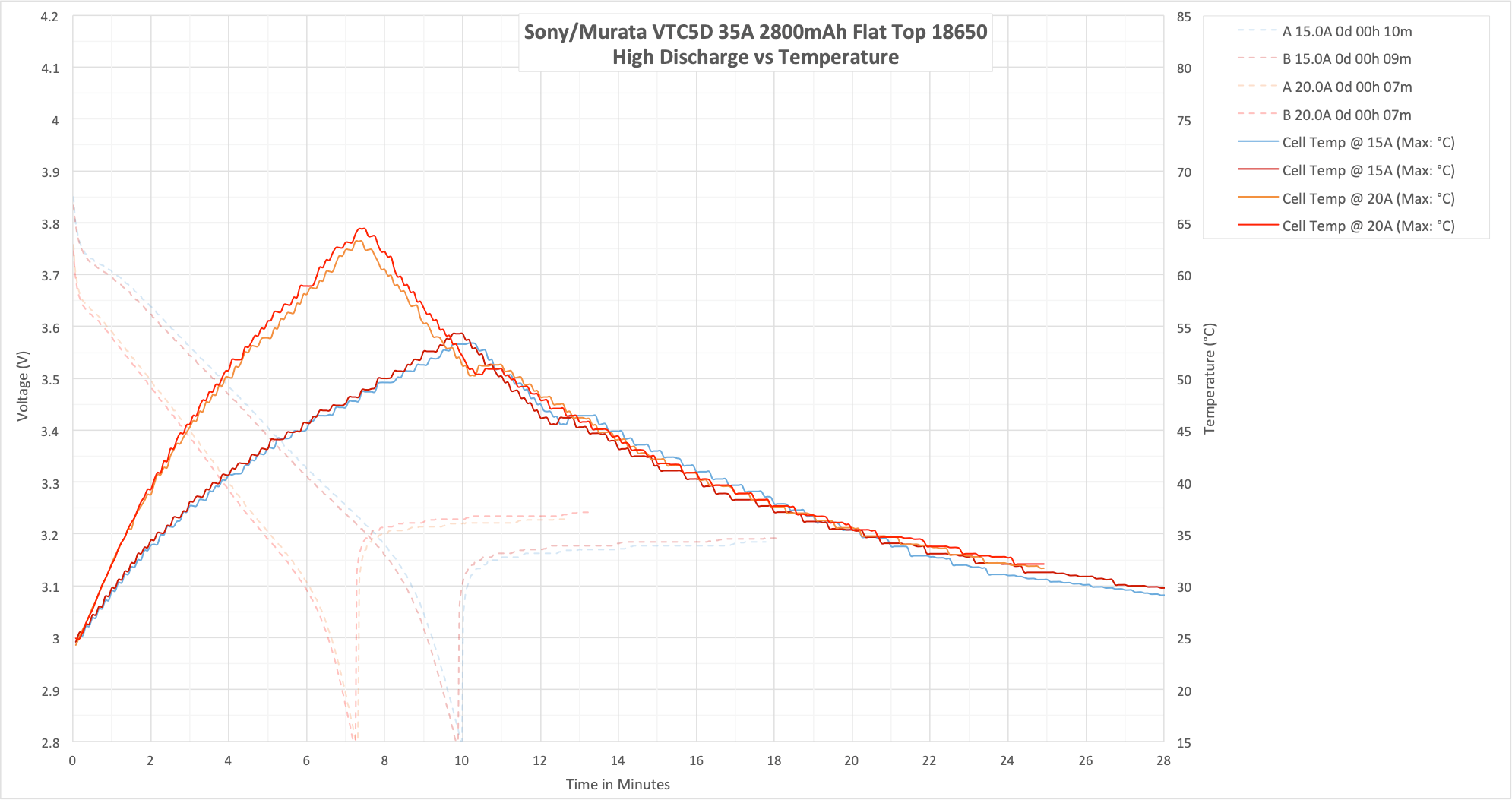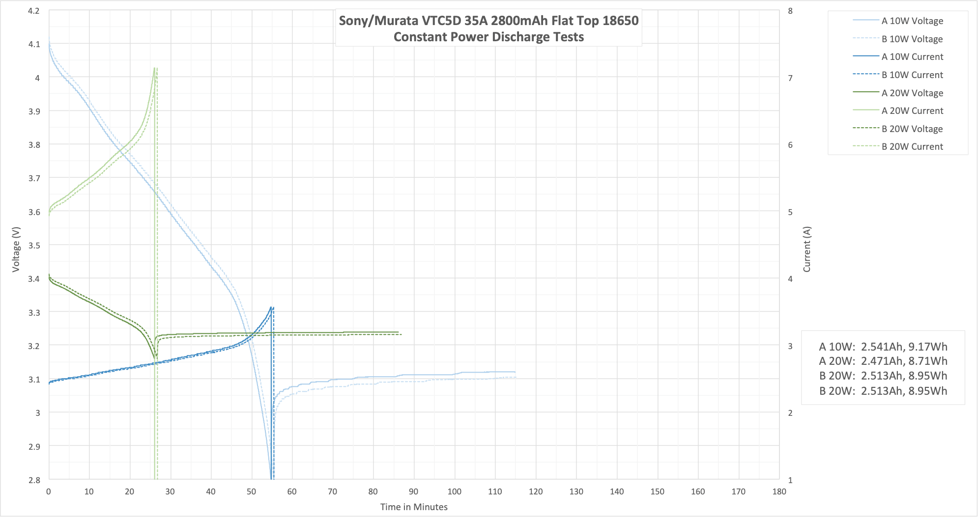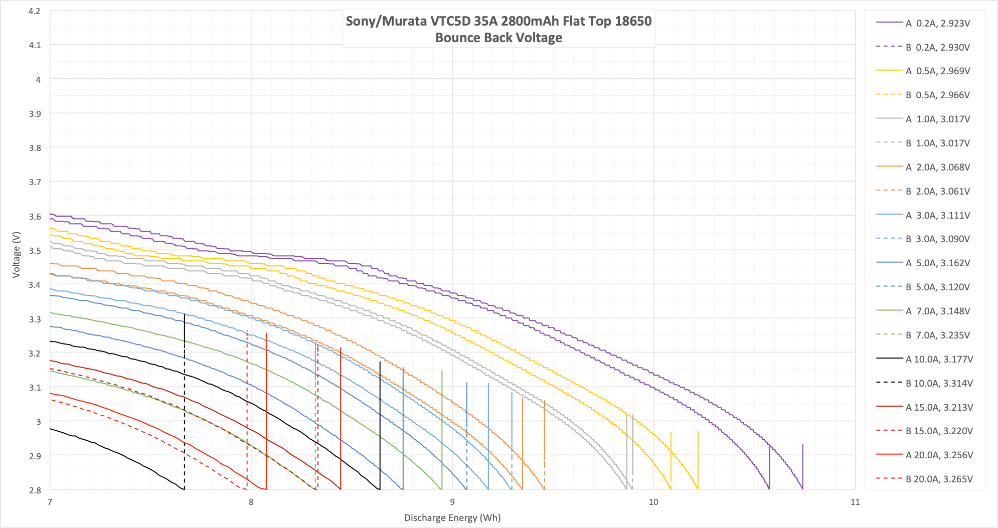 These cells are rated up to 35A, and I test only up to 20A. What we’d expect to see is that the bounce at 20A is “fairly low” since the cell should be very capable at higher currents. And that’s what we see – even at 20A, the bounce back is fairly low.