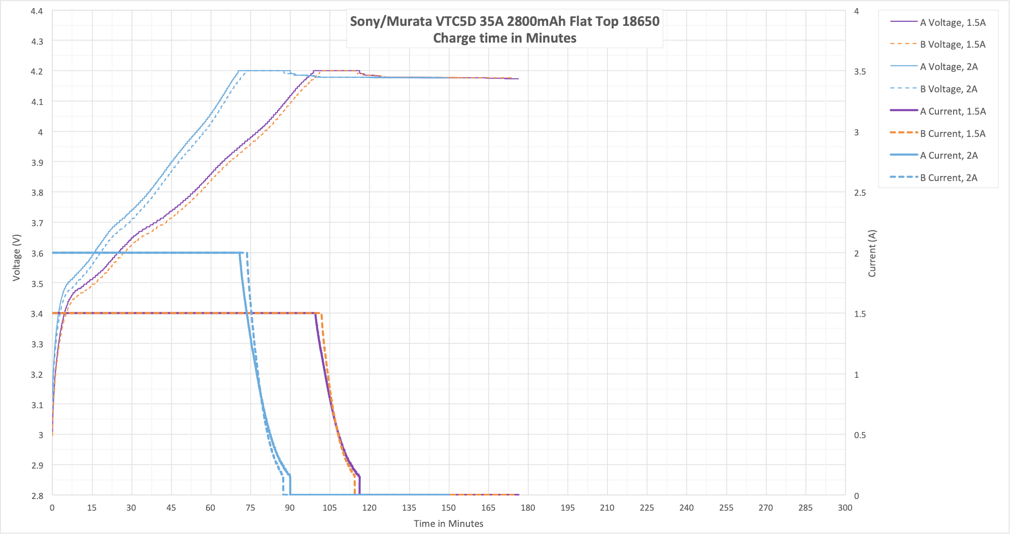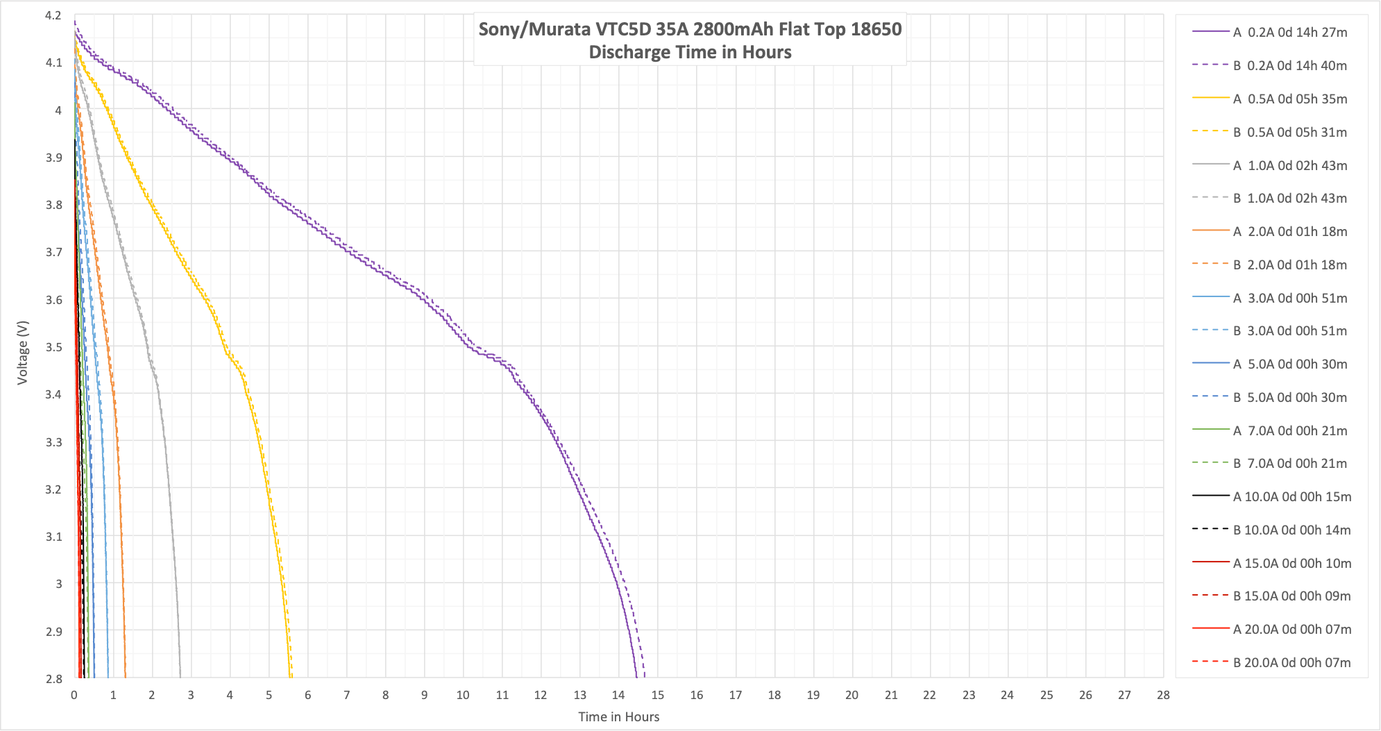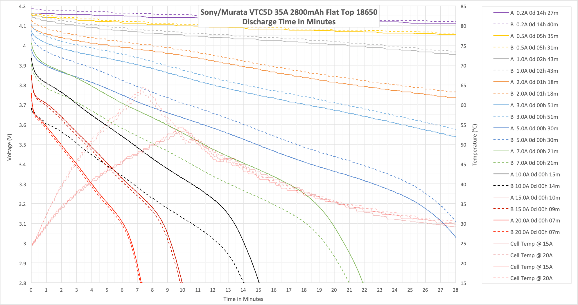 These cells are rated up to 35A, and I test only up to 20A. What we’d expect to see is that the bounce at 20A is “fairly low” since the cell should be very capable at higher currents. And that’s what we see – even at 20A, the bounce back is fairly low.