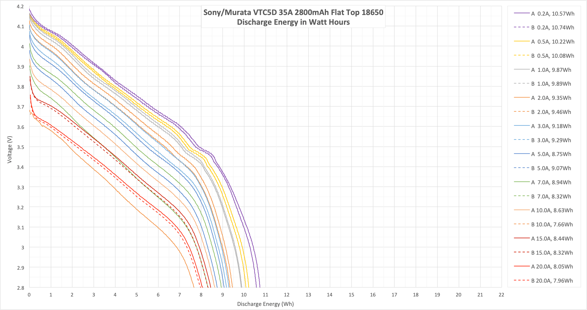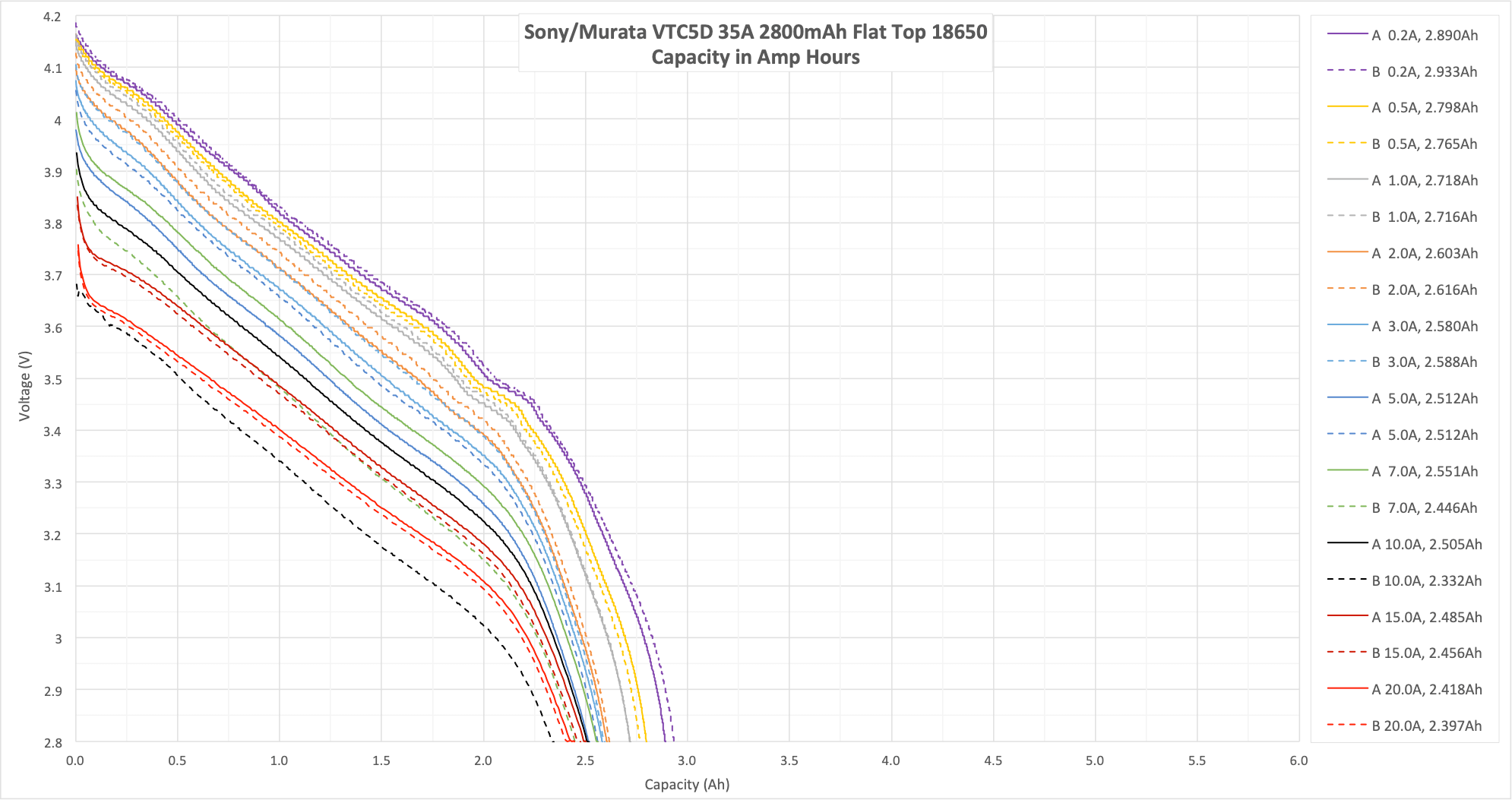 At 0.2A and even 0.5A, the cells meet their claimed 2800mAh rating.