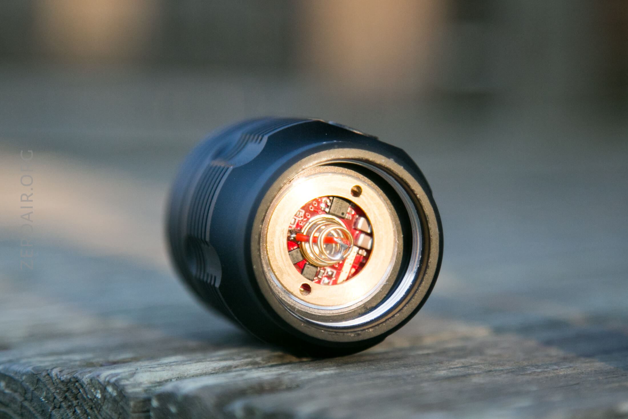 Note below that the tailspring is already bypassed for great high current performance. There’s no switch or anything in there – the brass retaining ring holds a small PCB with no electronics. The back of this PCB has two pads that pass the current through to the tailcap. This seems a bit overly complicated, but there’s probably a great reason for doing it this way (Probably easier to build this way!)